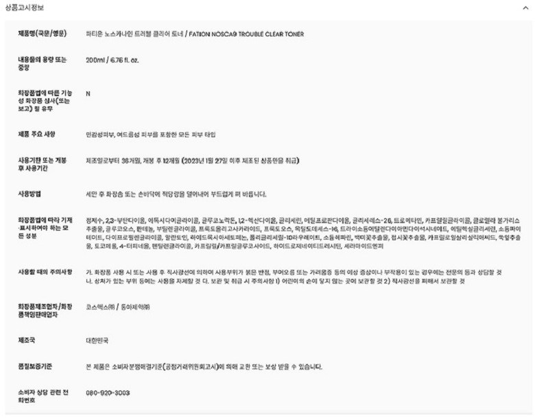 | 화장품제조업자, 화장품책임판매업자 및 맞춤형화장품판매업자 | 컨텐츠 참조 | 제조국 | 대한민국 |