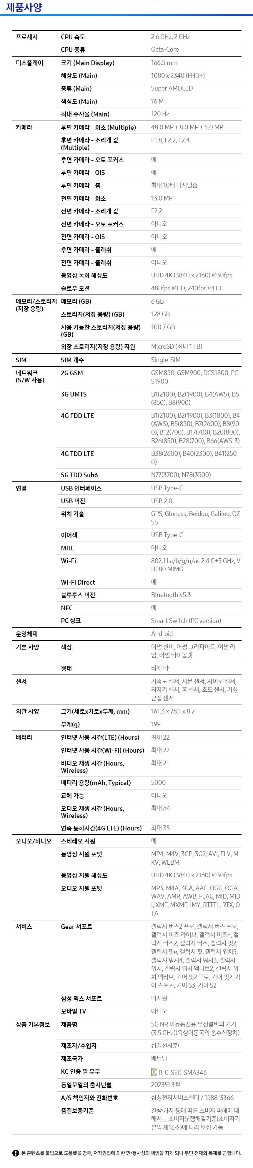 | 품명 및 모델명 | 5G NR 이동통신용 무선설비의 기기(3.5 GHz)(육상이동국의 송수신장치) / SM-A346N | KC 인증정보 | 유 / KC마크, R-C-SEC-SMA346 |