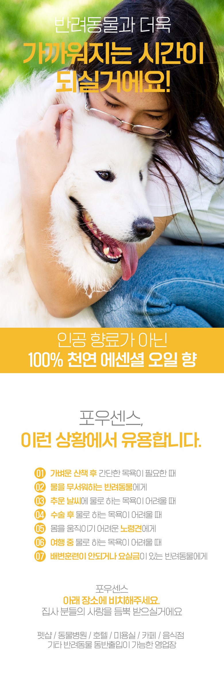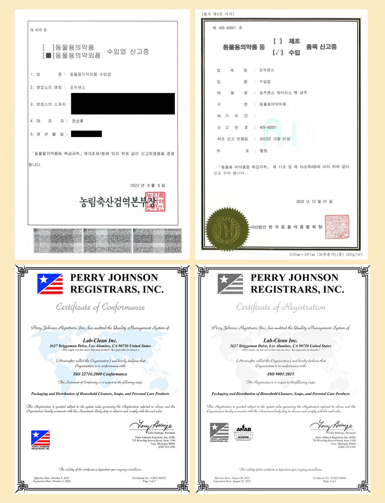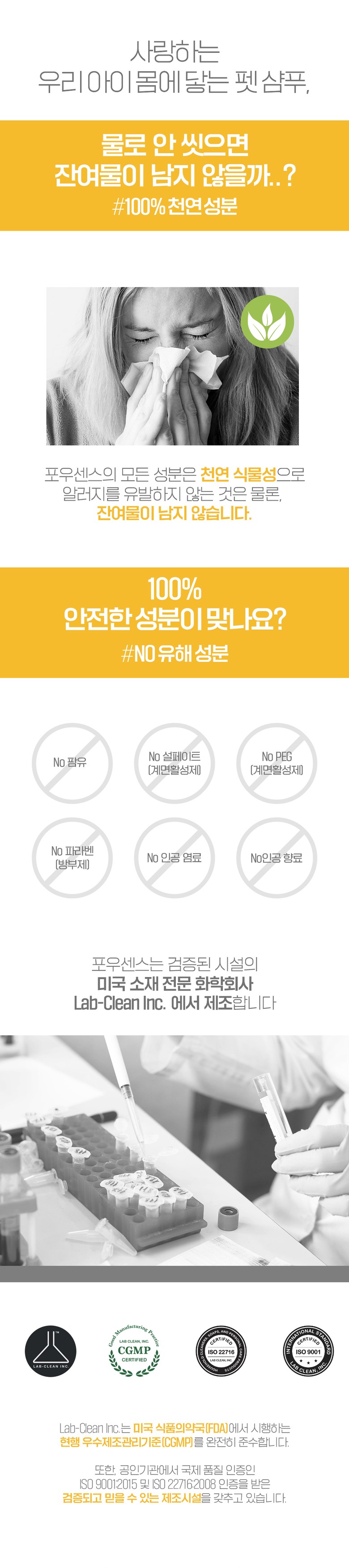 | 품명 및 모델명 | 포우센스 워터리스 펫 샴푸 | 인증사항 | 동물용 의약외품 409-A0001 |