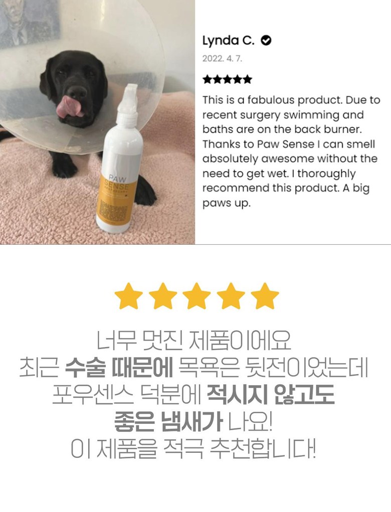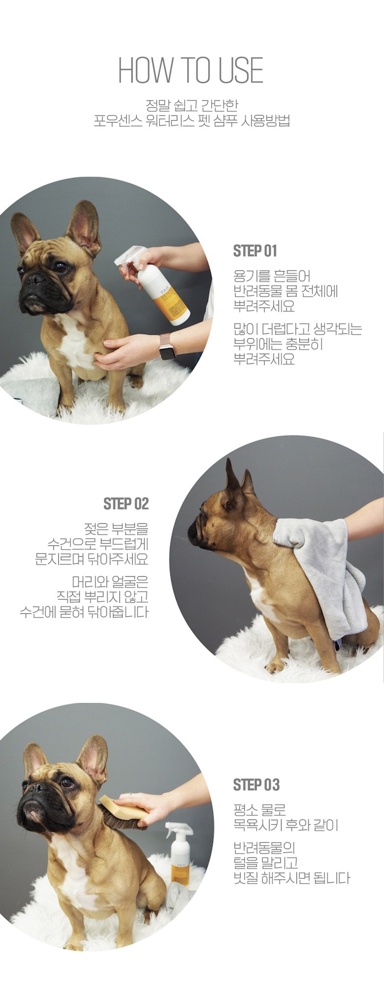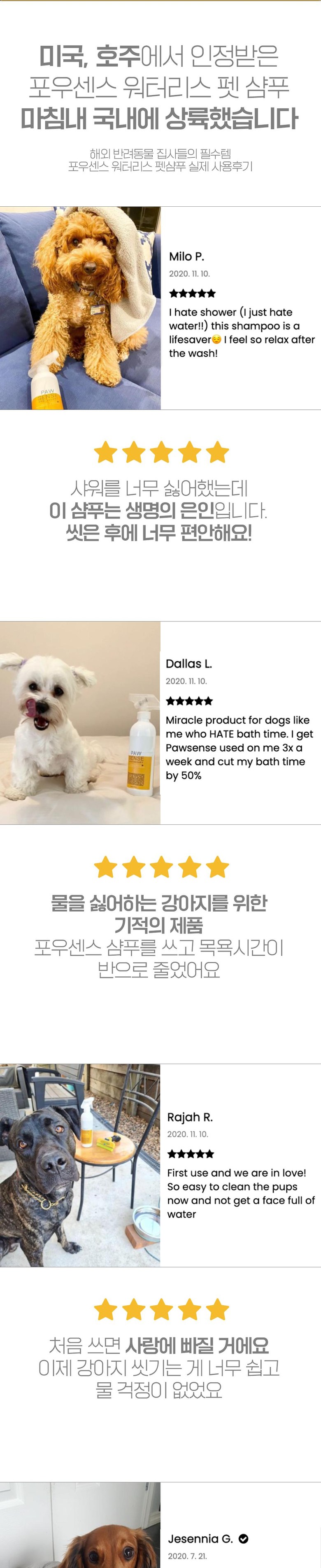 | 품명 및 모델명 | 포우센스 워터리스 펫 샴푸 | 인증사항 | 동물용 의약외품 409-A0001 |