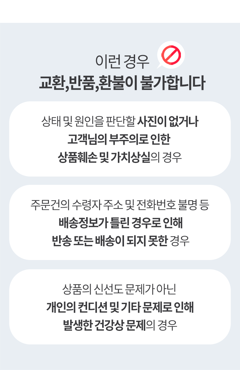 | 계절상품/식품/화장품 | ㆍ신선/냉장/냉동 상품의 단순변심의 경우 ㆍ뷰티 상품 이용 시 트러블(알러지, 붉은 반점, 가려움, 따가움)이 발생하는 경우, |