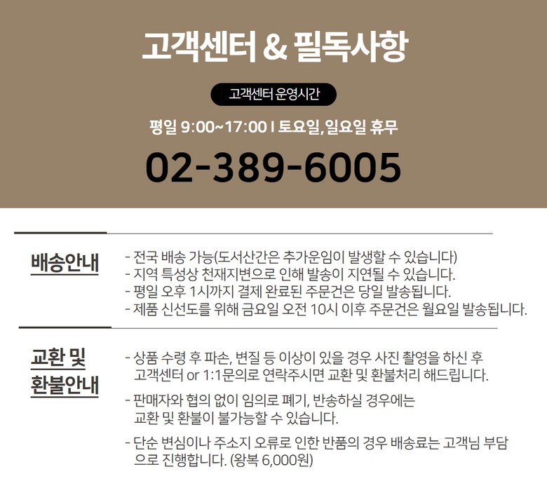 - ㆍ모니터 해상도의 차이로 인해 색상이나 이미지가 실제와 달라, 고객이 단순 변심으로 교환/반품을 무료로 요청하는 경우