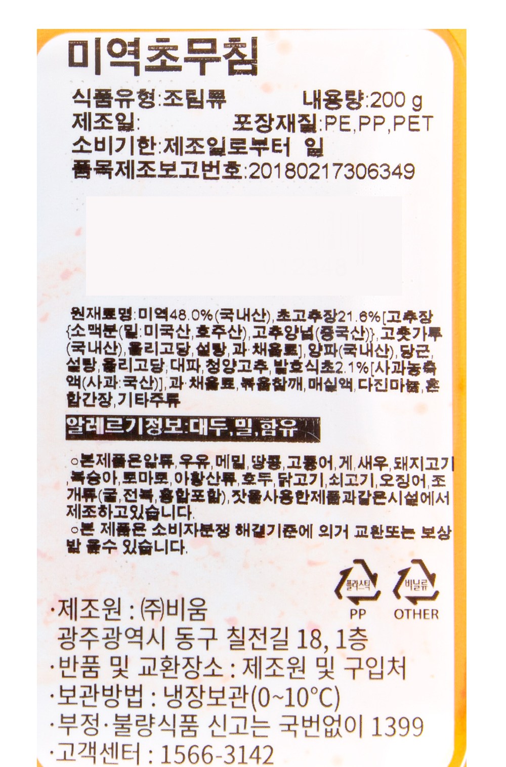 | 제품명 | 미역초무침 | 식품의 유형 | 컨텐츠 참조 |