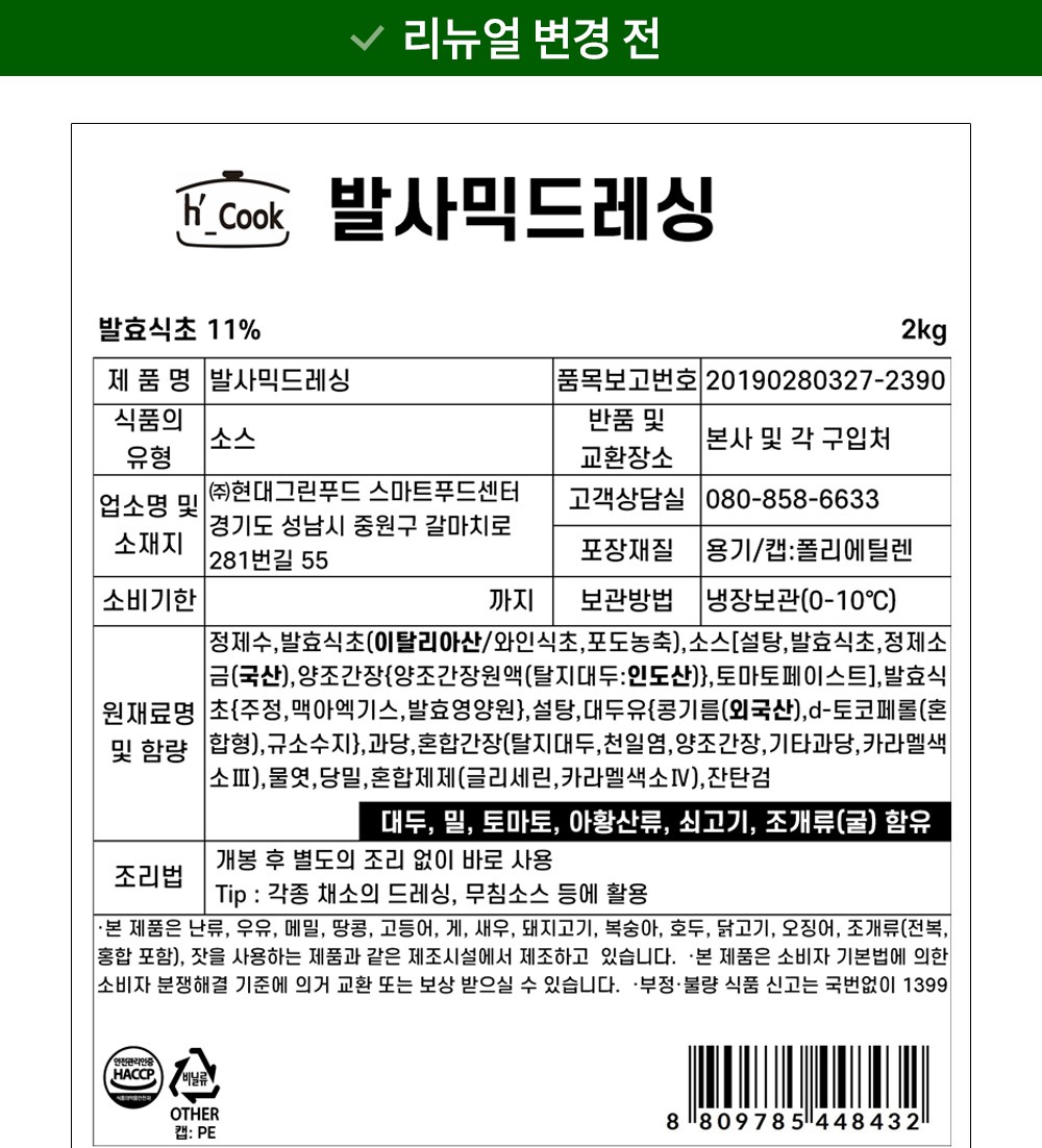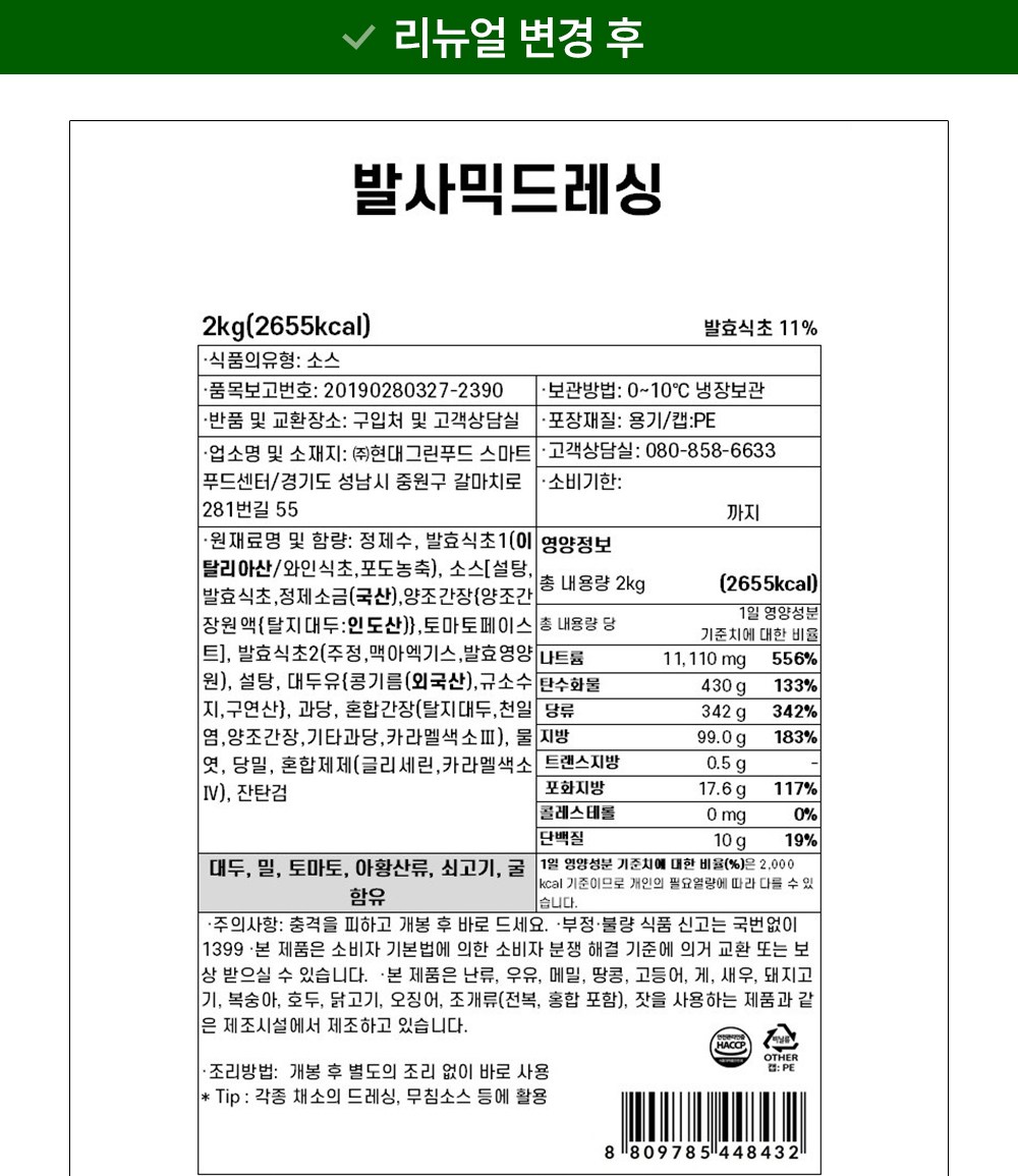 | 제품명 | 발사믹 드레싱 | 식품의 유형 | 컨텐츠 참조 |