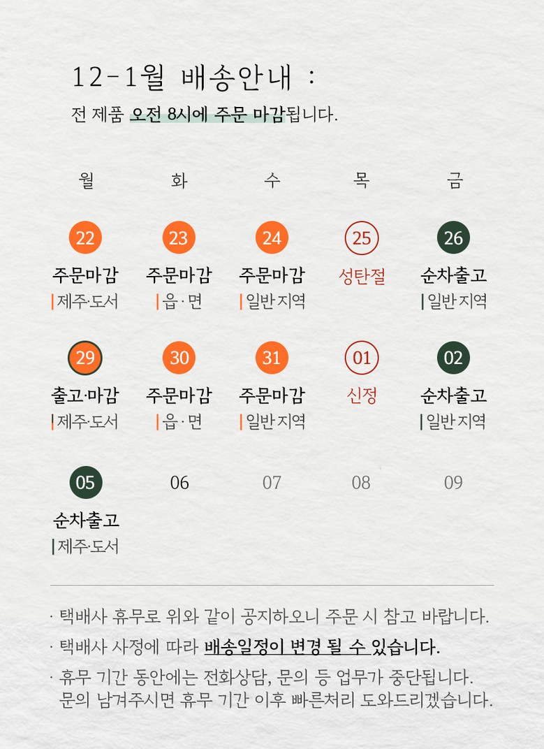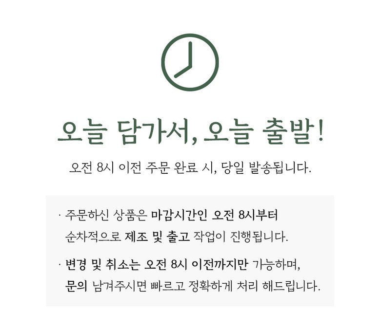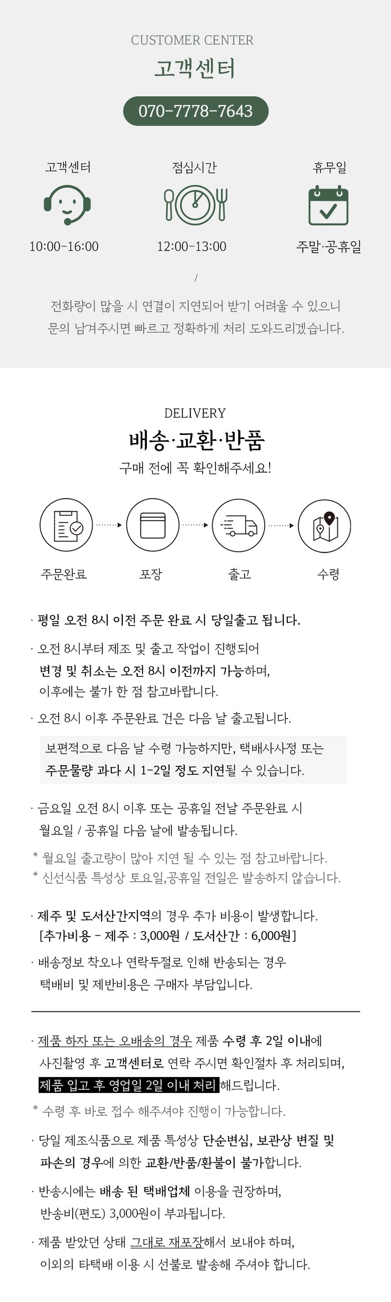 | 생산자 및 소재지 | 상품상세참조 | 제조연월일, 소비기한 또는 품질유지기한 | 주문일 당일제조, 제조일로부터 80일 |