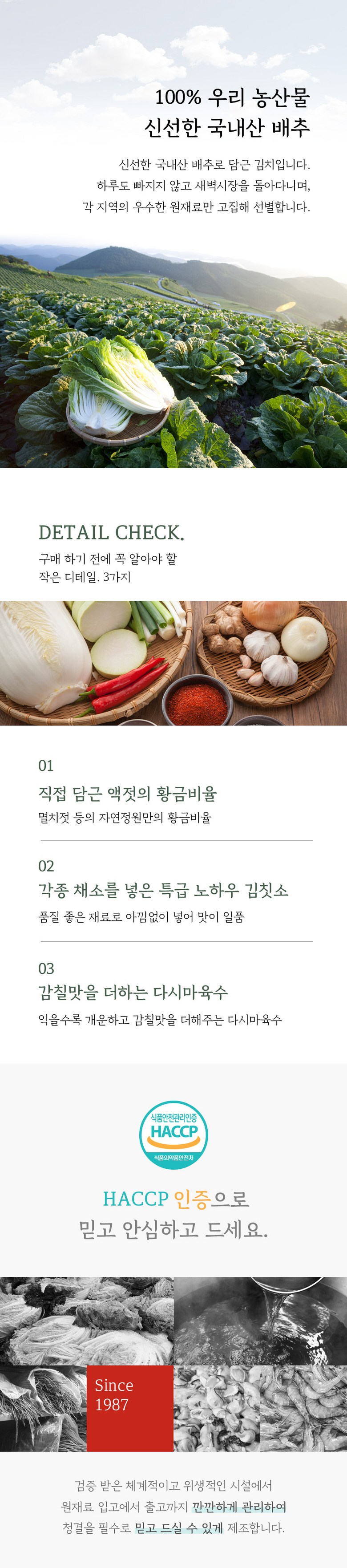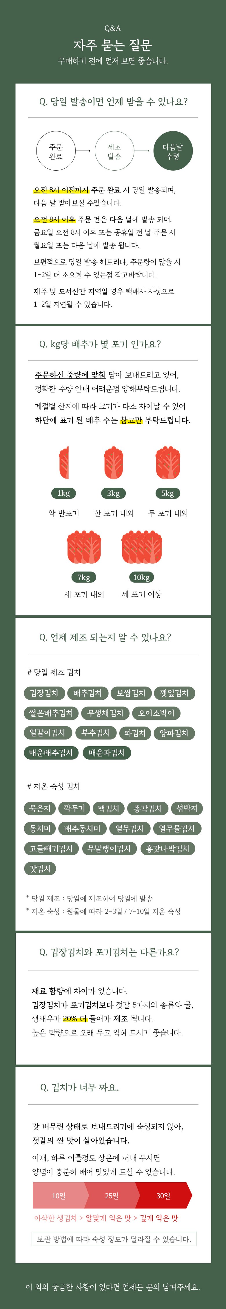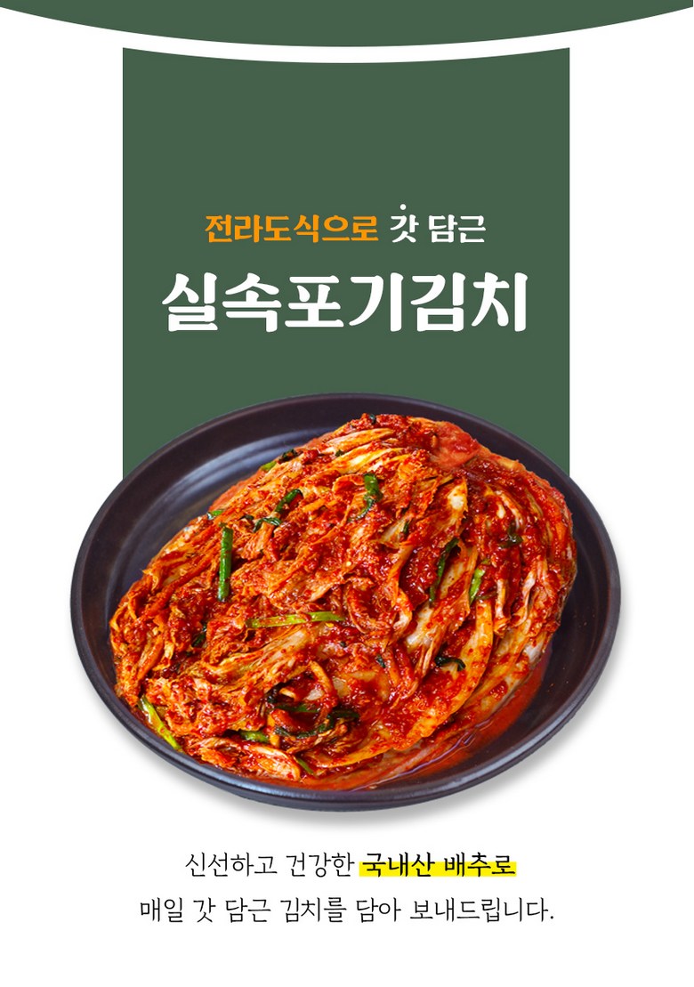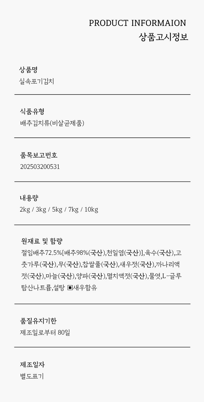 | 포장단위별 내용물의 용량(중량), 수량 | 2kg/3kg/5kg/7kg/10kg, 1개 | 원재료명 및 함량 | 절임배추72.5%[배추98%(국산),천일염(국산)],육수(국산),고춧가루(국산),무(국산),찹쌀풀(국산),새우젓(국산),까나리액젓(국산),마늘(국산),양파(국산),멸치액젓(국산),물엿,L-글루탐산나트륨,설탕 ▣새우함유 |