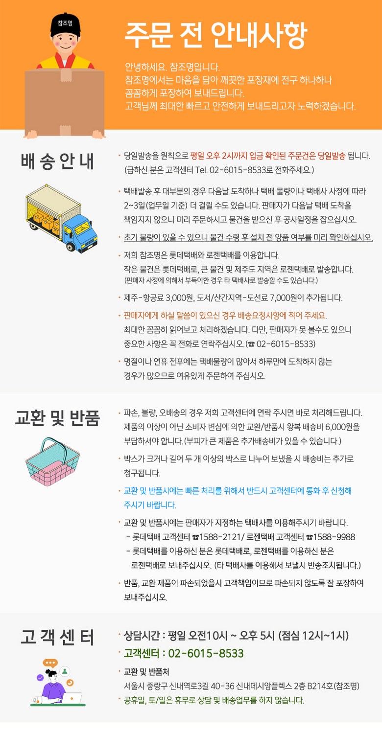 - ㆍ모니터 해상도의 차이로 인해 색상이나 이미지가 실제와 달라, 고객이 단순 변심으로 교환/반품을 무료로 요청하는 경우