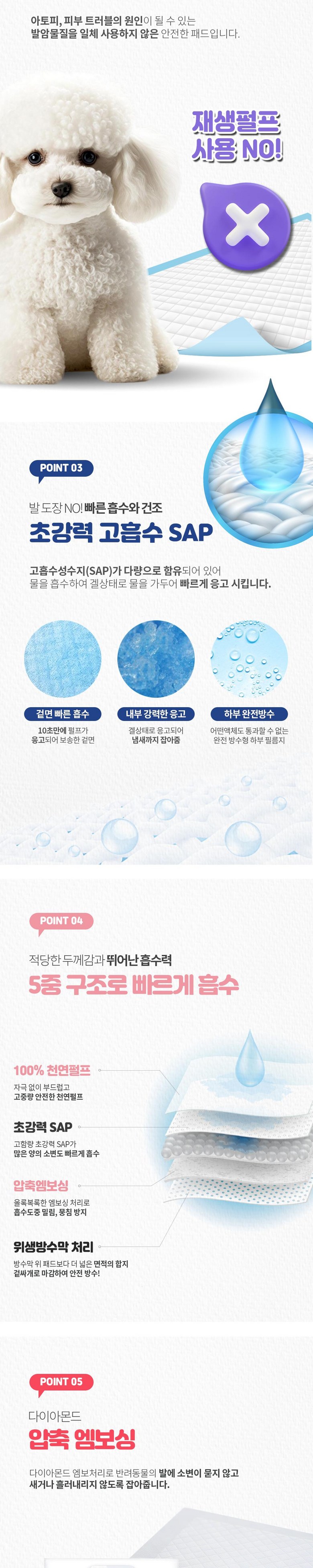 - 흡수력: 고흡수성수지 (SAP) 포함