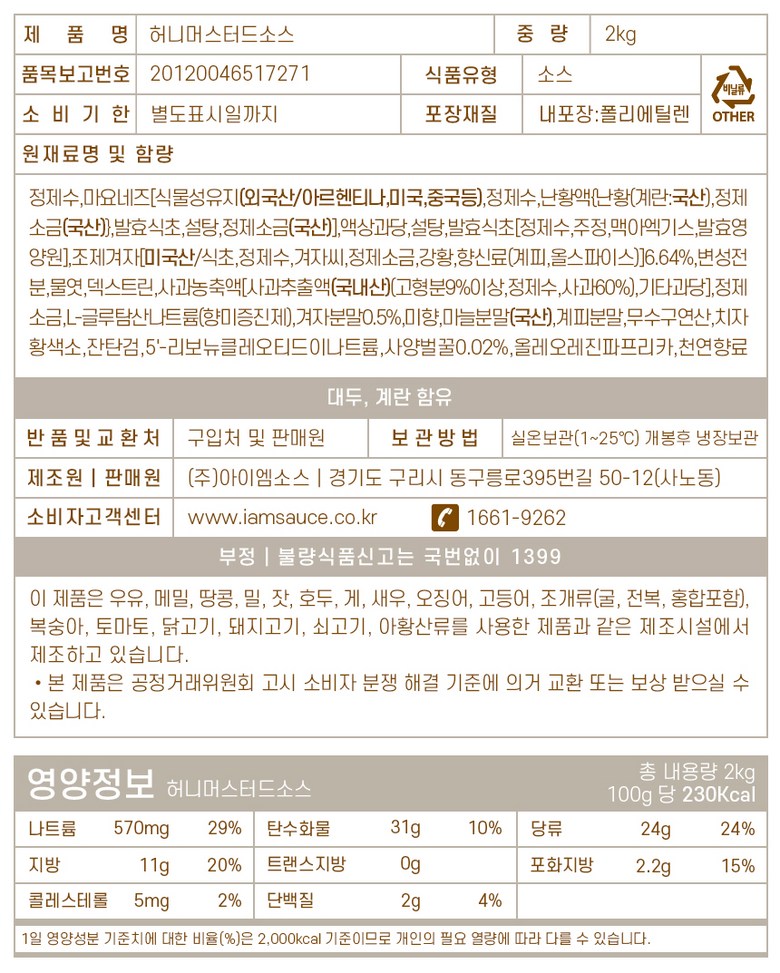 | 포장단위별 내용물의 용량(중량), 수량 | 2kg / 1ea | 원재료명 및 함량 | 정제수,마요네즈[식물성유지(외국산/아르헨티나,미국,중국등),정제수,난황액{난황(계란:국산),정제소금(국산)},발효식초,설탕,정제소금(국산)],액상과당,설탕,발효식초[정제수,주정,맥아엑기스,발효영양원],조제겨자[미국산/식초,정제수,겨자씨,정제소금,강황,향신료(계피,올스파이스)]6.64%,변성전분,물엿,덱스트린,사과농축액[사과추출액(국내산)(고형분9%이상,정제수,사과60%),기타과당],정제소금,L-글루탐산나트륨(향미증진제),겨자분말0.5%,미향,마늘분말(국산),계피분말,무수구연산,치자황색소,잔탄검,5'-리보뉴클레오티드이나트륨,사양벌꿀0.02%,올레오레진파프리카,천연향료 |