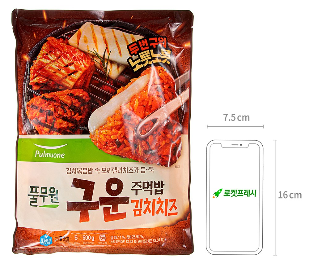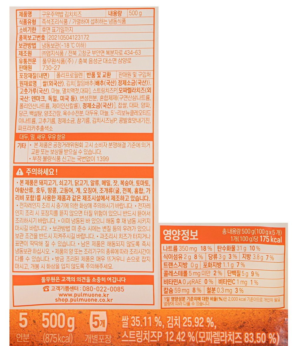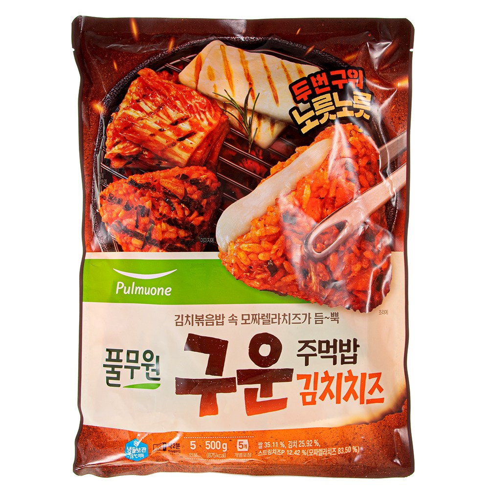 김치와 스트링치즈를 사용한 구운 주먹밥이에요. 치즈의 고소한 풍미와 김치의 매콤한 맛을 함께 즐길 수 있지요. 전자레인지나 에어프라이어로 간편하게 조리 가능하고, 개별로 포장되어 있어 보관이 편리하답니다.