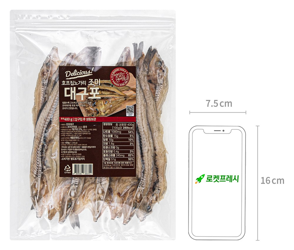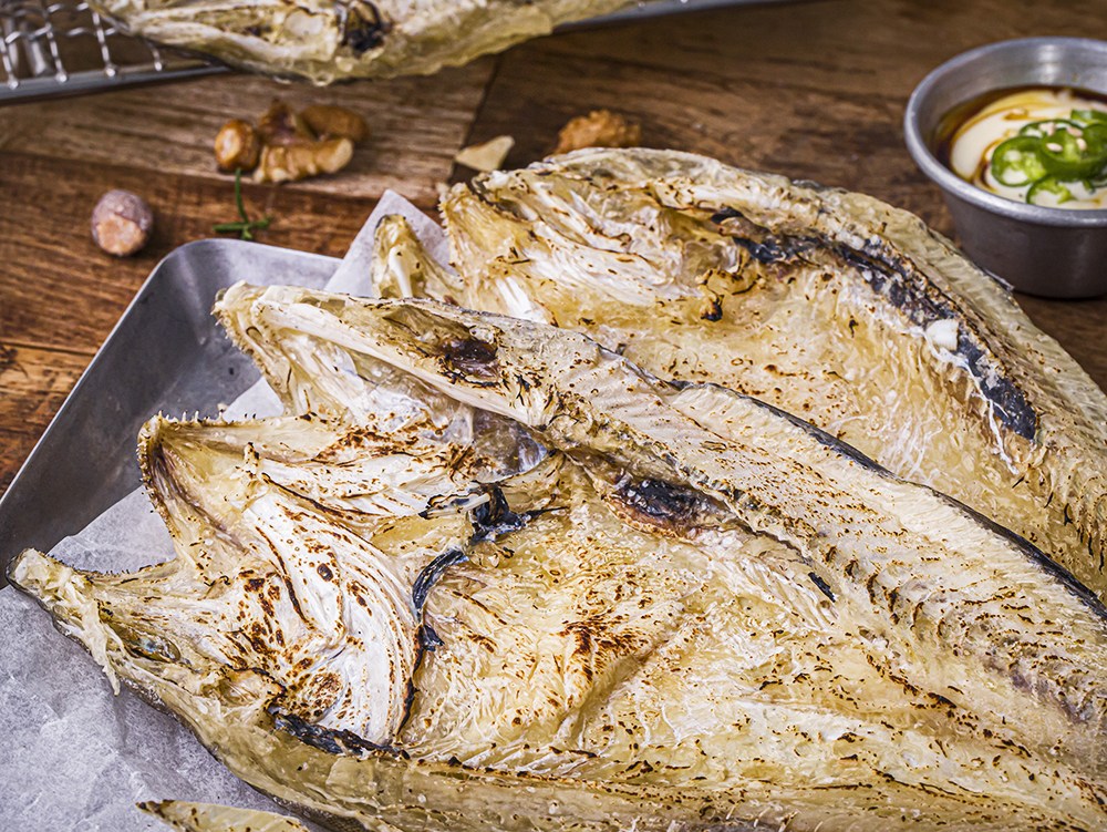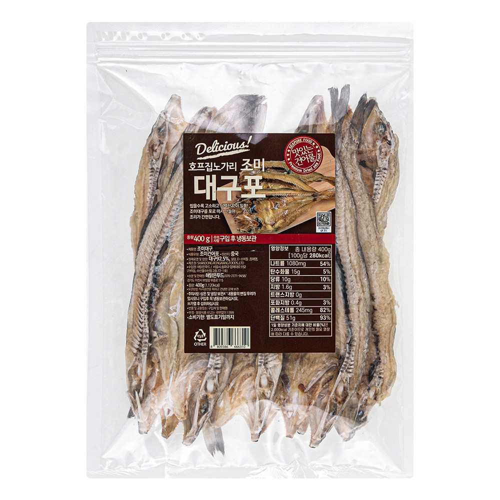 씹을수록 깊은 감칠맛과 고소함을 느낄 수 있는 조미 대구포예요. 고추장이나 마요네즈 등의 소스와 곁들이면 간단하고 담백한 안주가 완성되지요. 쫄깃쫄깃한 식감으로 씹는 재미도 쏠쏠하답니다.