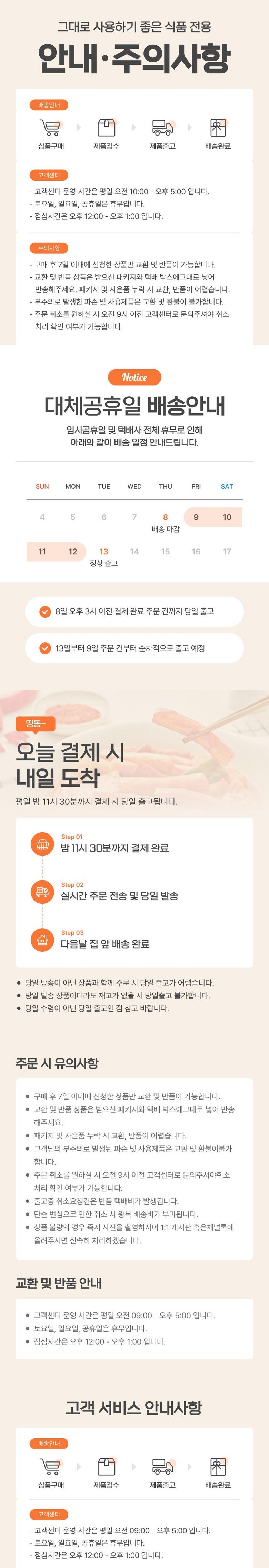 | 배송기간 | ㆍ도서산간 지역 등은 배송에 3-5일이 더 소요될 수 있습니다. - 천재지변, 물량 수급 변동 등 예외적인 사유 발생 시, 다소 지연될 수 있는 점 양해 부탁드립니다. | ||