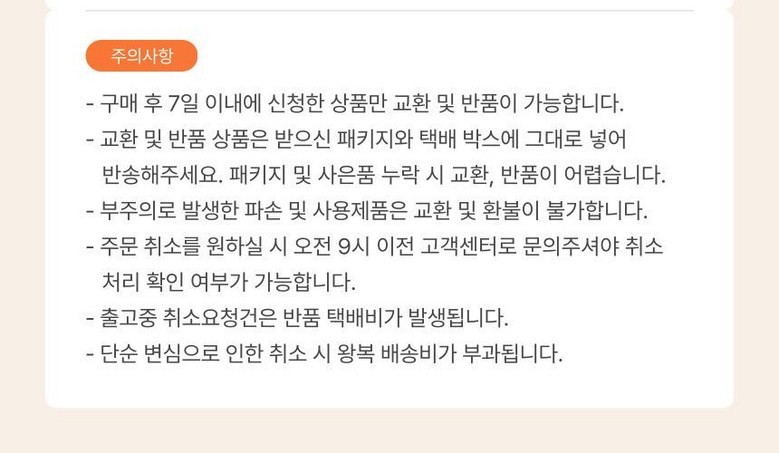 | 교환/반품 신청 기준일 | ㆍ단순변심에 의한 교환/반품은 제품 수령 후 7일 이내까지, 교환/반품 제한사항에 해당하지 않는 경우에만 가능 (배송비용과 교환/반품 비용 왕복배송비 고객부담) ㆍ상품의 내용이 표시·광고의 내용과 다른 경우에는 상품을 수령한 날부터 3개월 이내, 그 사실을 안 날 또는 알 수 있었던 날부터 |