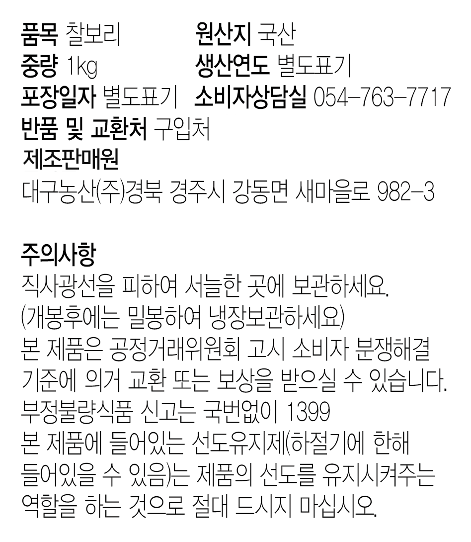 | 제조연월일, 소비기한 또는 품질유지기한 | 제조년월일 : 2025년 09월 24일 이후인 제조상품<br />생산일자 : 2025 | 세부 품목군별 표시사항 | 농수산물 : 유전자변형(해당 없음) / 지리적 표시사항(해당 없음) |