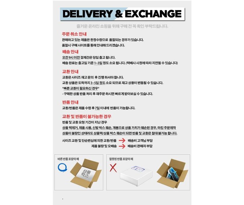 | 교환/반품 비용 (왕복비용) | 3,000원 - 단, 고객 변심의 경우에만 발생 - 도서산간 및 일부 지역 추가비용 발생 |