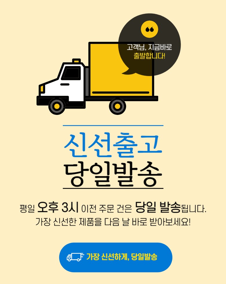 | 배송기간 | ㆍ도서산간 지역 등은 배송에 3-5일이 더 소요될 수 있습니다. - 천재지변, 물량 수급 변동 등 예외적인 사유 발생 시, 다소 지연될 수 있는 점 양해 부탁드립니다. | ||