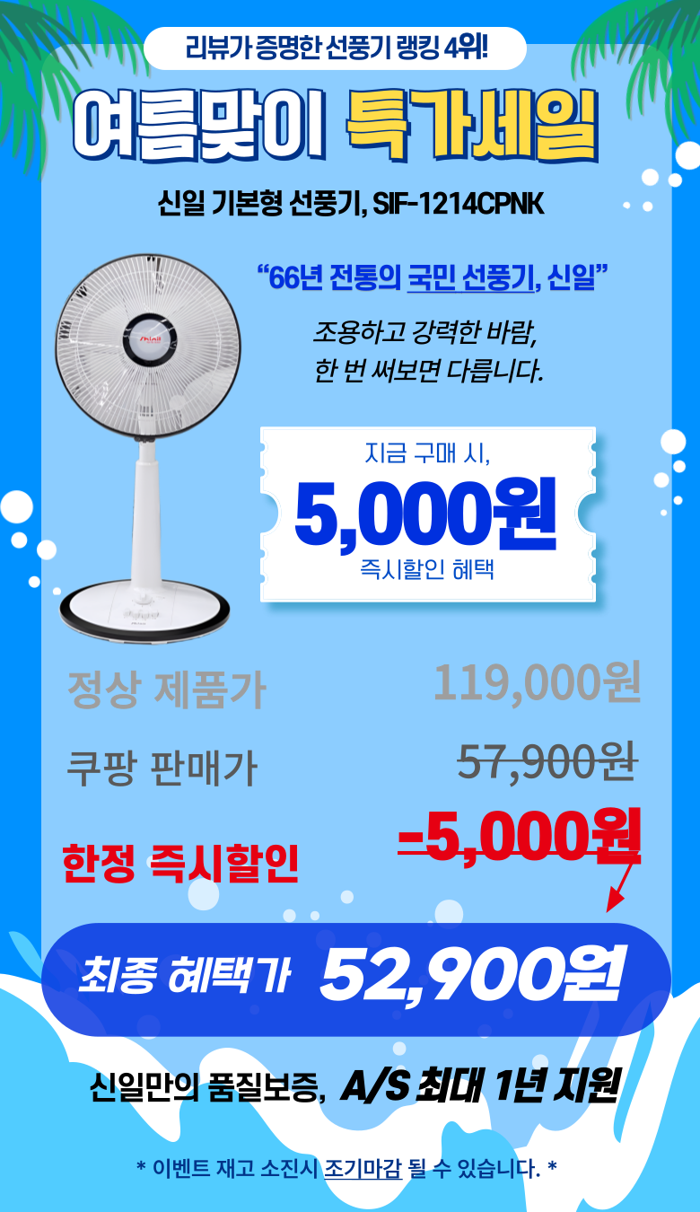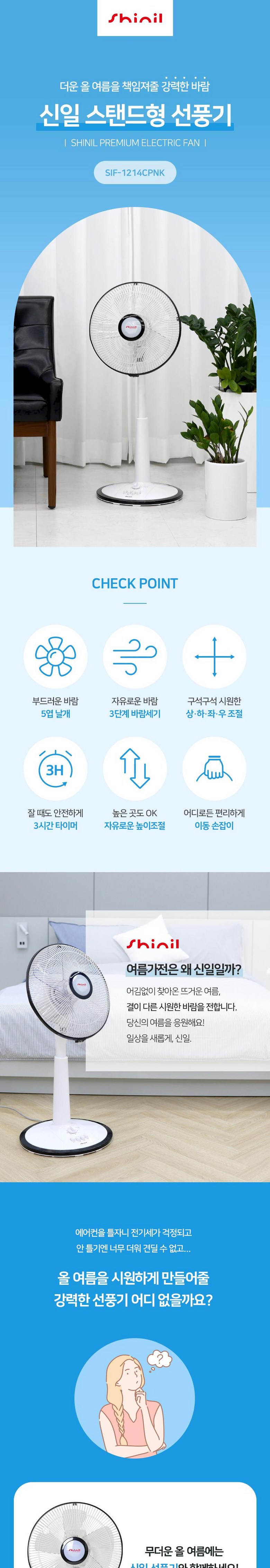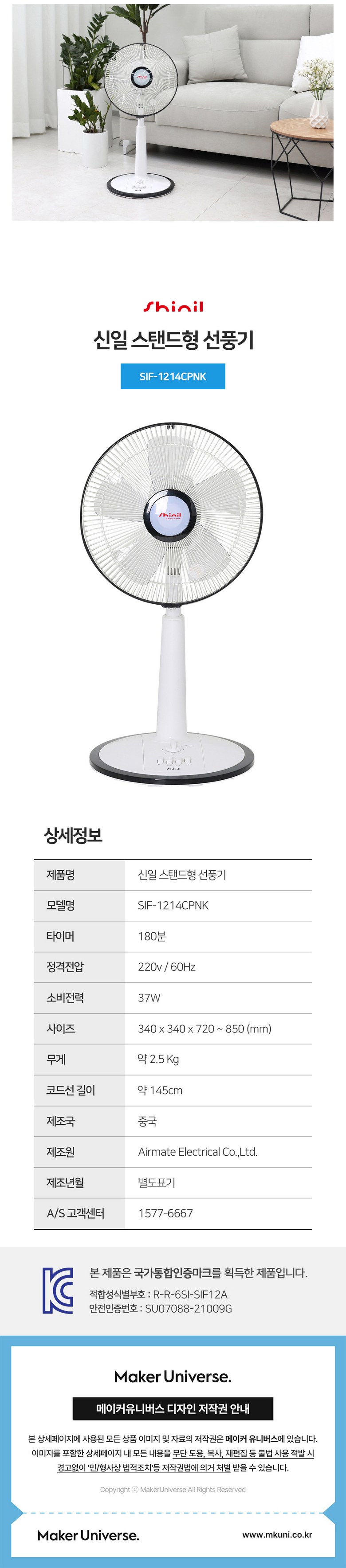 | 품명 및 모델명 | 신일 스탠드형 선풍기 /SIF-1214CPNK | KC 인증정보 | SU07088-21009G |