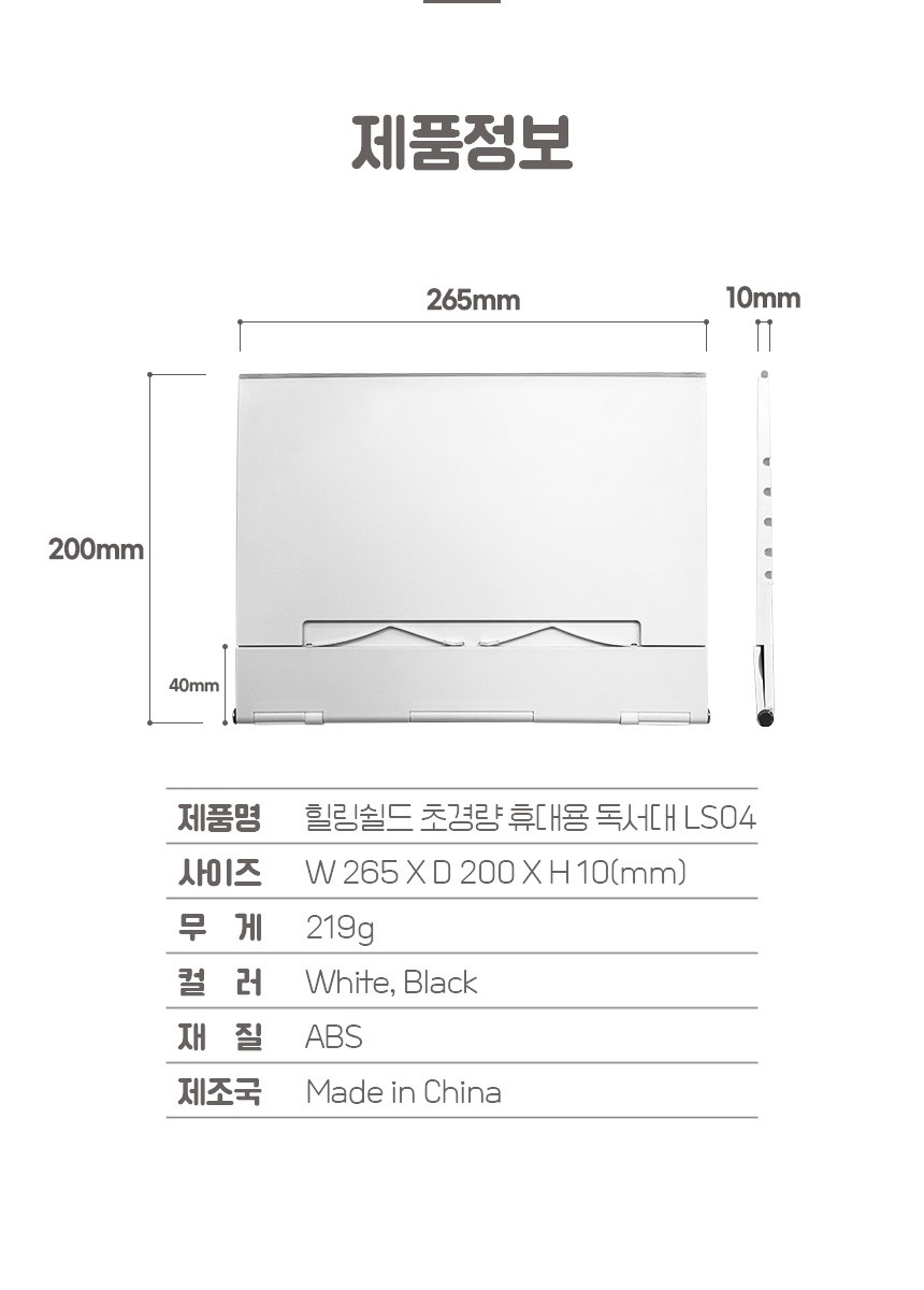 | 품명 및 모델명 | 초슬림 독서대 책받침대 LS04 | 인증/허가 사항 | 해당없음(14세 이상) |