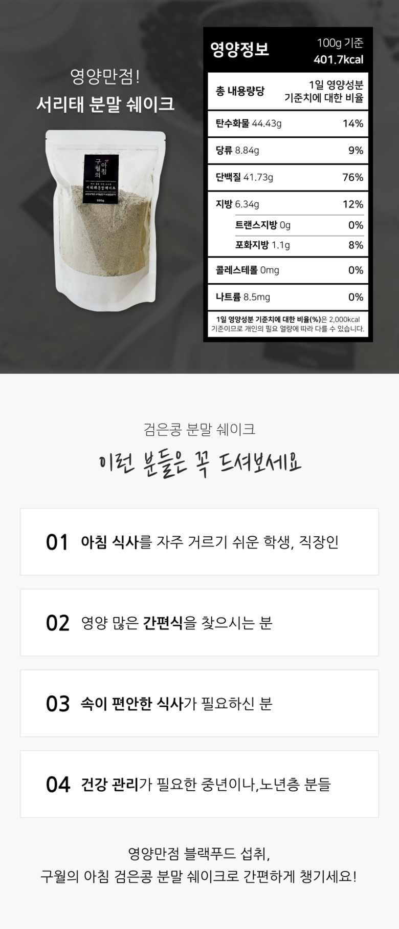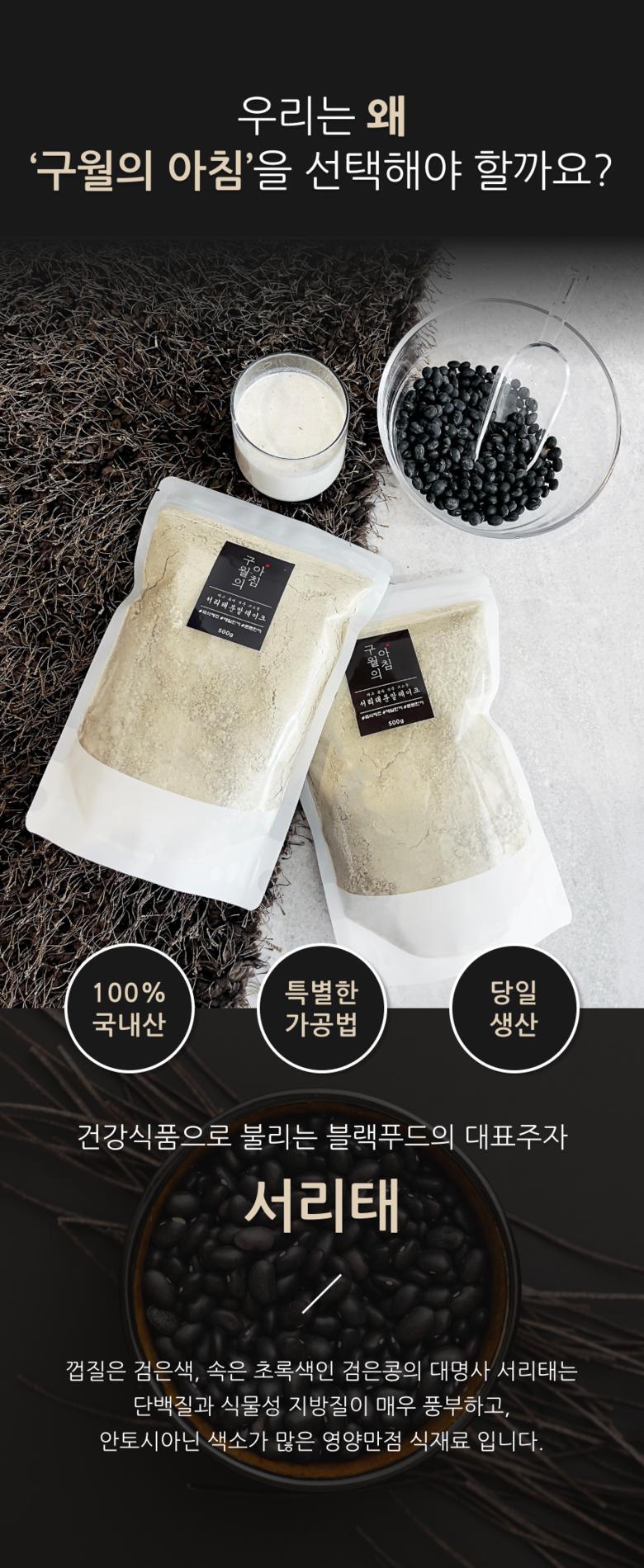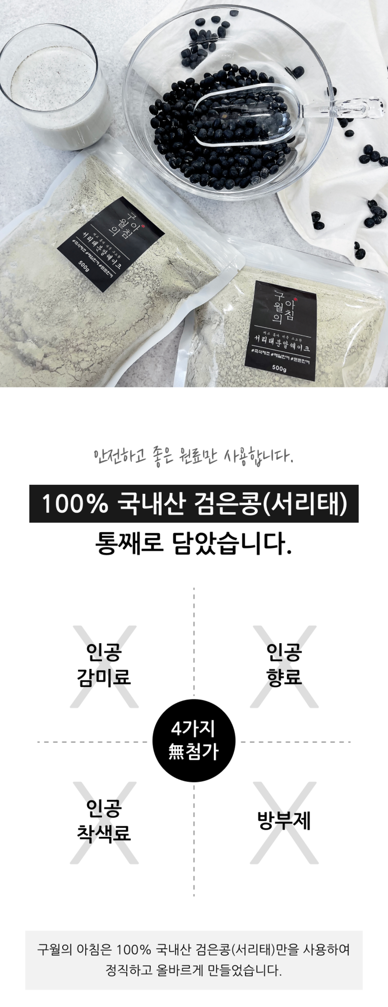 | 원재료명 및 함량 | 국산 서리태분말 100% | 영양성분 | 상세페이지참고 |