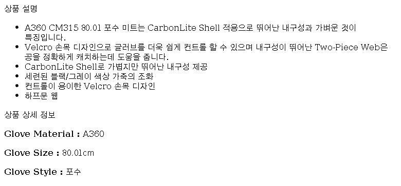 | 품명 및 모델명 | 윌슨 A360 포수 미트 우투용 CM315 | KC 인증정보 | 해당없음 |