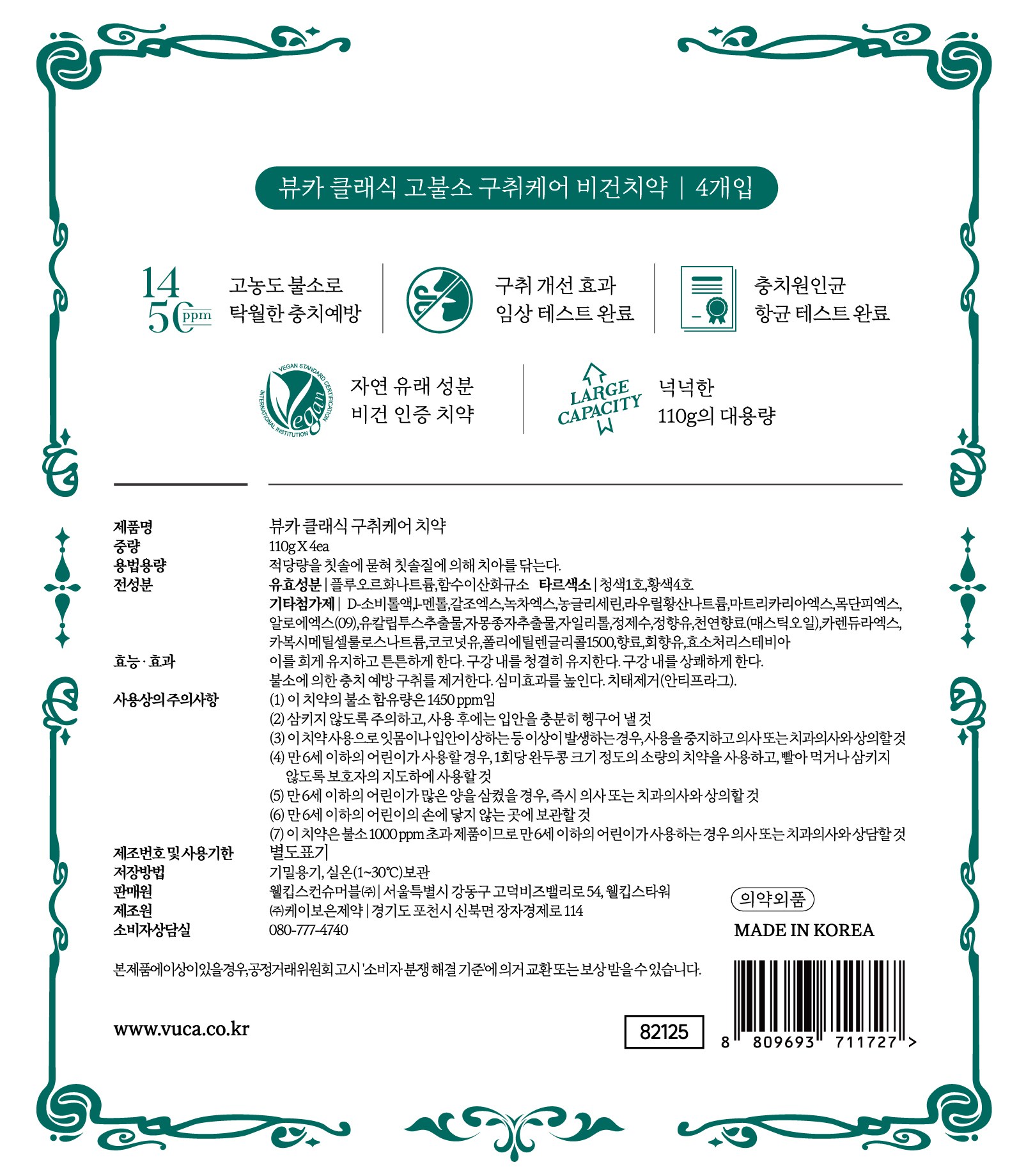 | 품명 및 모델명 | 뷰카클래식구취케어치약 | 인증/허가 사항 | 의약외품 |