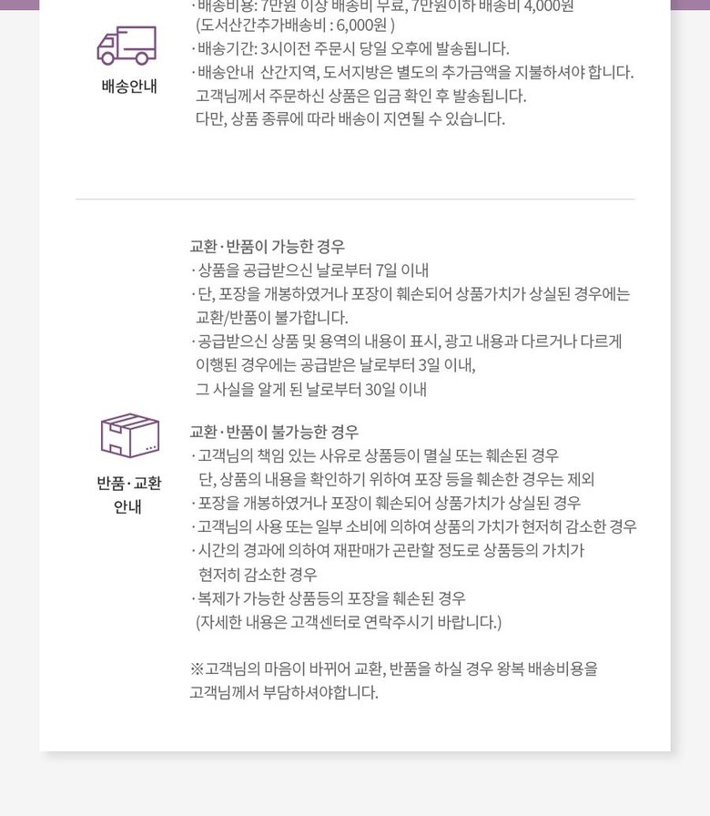 | 교환/반품 신청 기준일 | ㆍ단순변심에 의한 교환/반품은 제품 수령 후 7일 이내까지, 교환/반품 제한사항에 해당하지 않는 경우에만 가능 (배송비용과 교환/반품 비용 왕복배송비 고객부담) ㆍ상품의 내용이 표시·광고의 내용과 다른 경우에는 상품을 수령한 날부터 3개월 이내, 그 사실을 안 날 또는 알 수 있었던 날부터 |