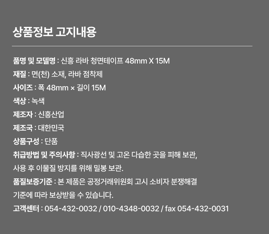| 품명 및 모델명 | 신흥 라바 청면테이프 48mmX15m | 인증/허가 사항 | 해당없음 (14세 이상) |