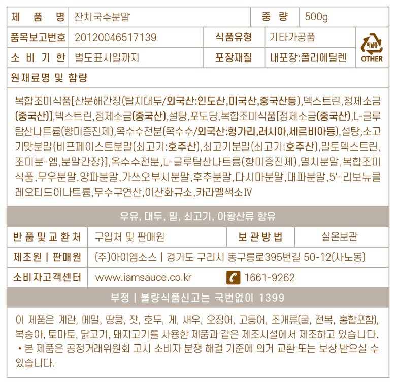 | 포장단위별 내용물의 용량(중량), 수량 | 500g | 원재료명 및 함량 | 복합조미식품[산분해간장{산분해간장원액(탈지대두/인도산),주정},덱스트린,정제소금(중국산)],덱스트린,정제소금(중국산),설탕,포도당,복합조미식품[정제소금(중국산),L-글루탐산나트륨(향미증진제),옥수수전분(옥수수/외국산:헝가리,러시아,세르비아등),설탕,소고기맛분말{비프페이스트분말(쇠고기:호주산),쇠고기분말(쇠고기:호주산),말토덱스트린,조미분-엠,분말간장}],옥수수전분,L-글루탐산나트륨(향미증진제),멸치분말,복합조미식품,무우분말,양파분말,가쓰오부시분말,후추분말,다시마분말,대파분말,5'-리보뉴클레오티드이나트륨,무수구연산,이산화규소,카라멜색소Ⅳ |