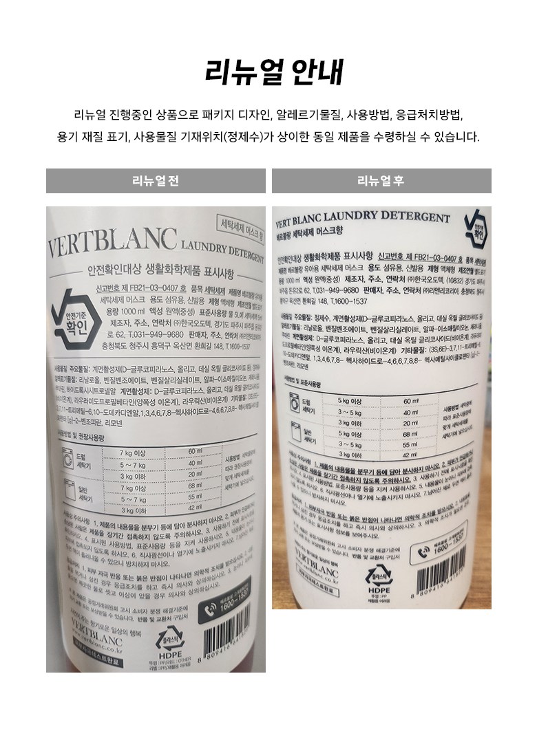 | 품목 및 제품명 | 세탁세제 / 베르블랑 유아용 세탁세제 머스크 | 용도(표백제의 경우 계열을 함께표시) 및 제형 | 섬유용, 신발용 / 액체형 |