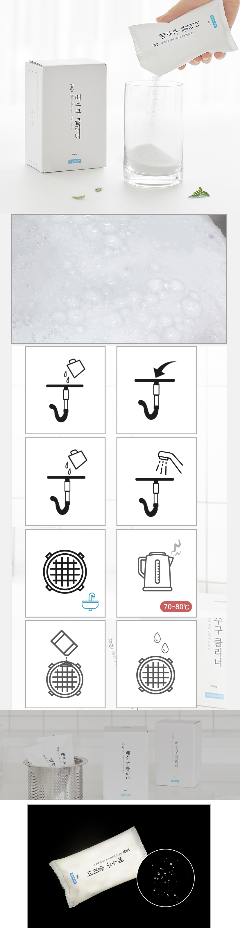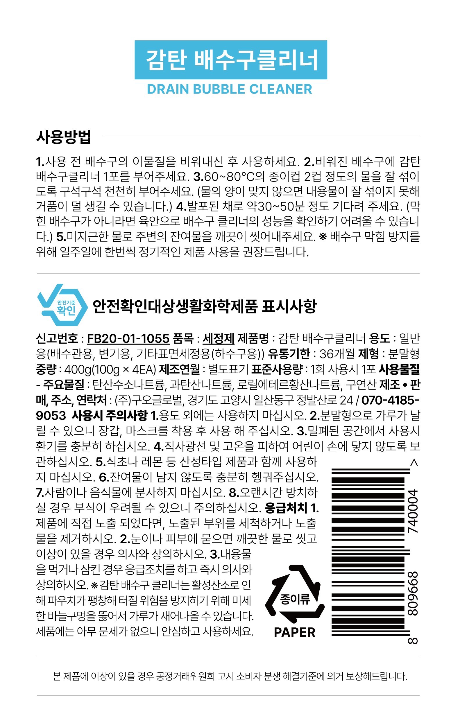 | 품목 및 제품명 | 세정제 / 감탄 배수구 클리너 | 용도(표백제의 경우 계열을 함께표시) 및 제형 | 일반용-변기용,일반용-배수관용,일반용-기타표면세정용-하수구용, 분말형 |