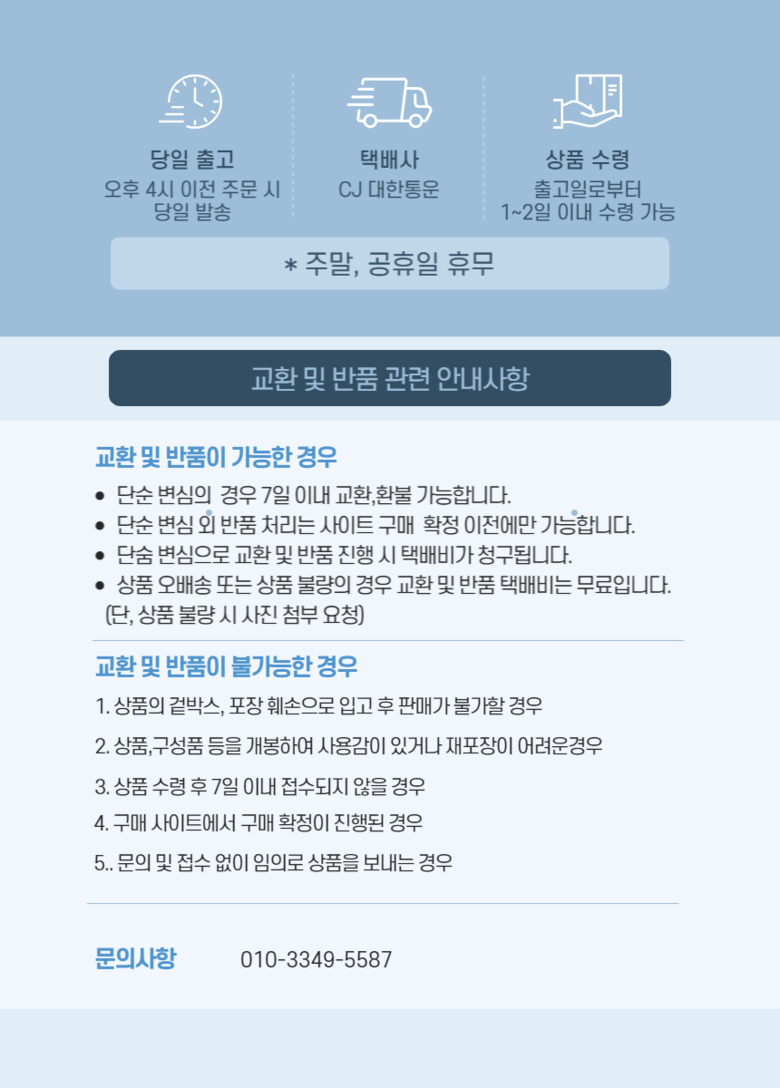 - ㆍ모니터 해상도의 차이로 인해 색상이나 이미지가 실제와 달라, 고객이 단순 변심으로 교환/반품을 무료로 요청하는 경우