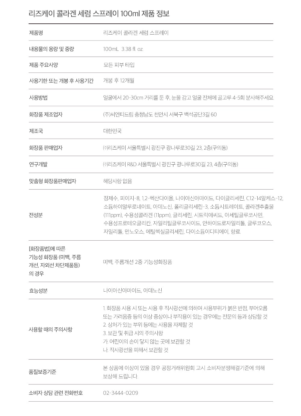 | 화장품제조업자, 화장품책임판매업자 및 맞춤형화장품판매업자 | 컨텐츠 참조 | 제조국 | 대한민국 |