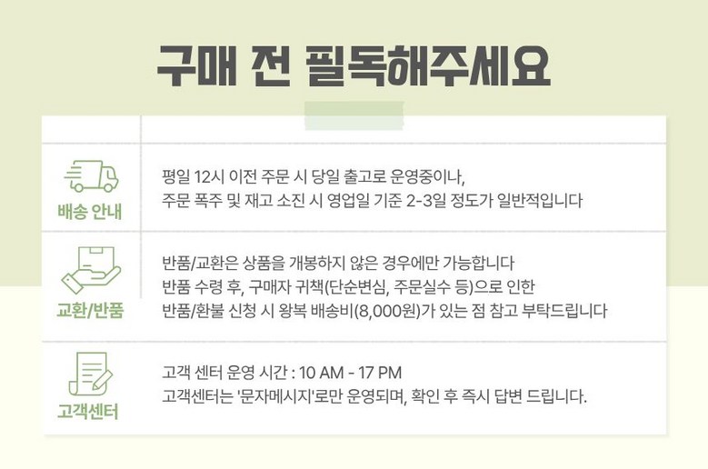 | 교환/반품 비용 (왕복비용) | 8,000원 - 단, 고객 변심의 경우에만 발생 - 도서산간 지역 배송불가 |