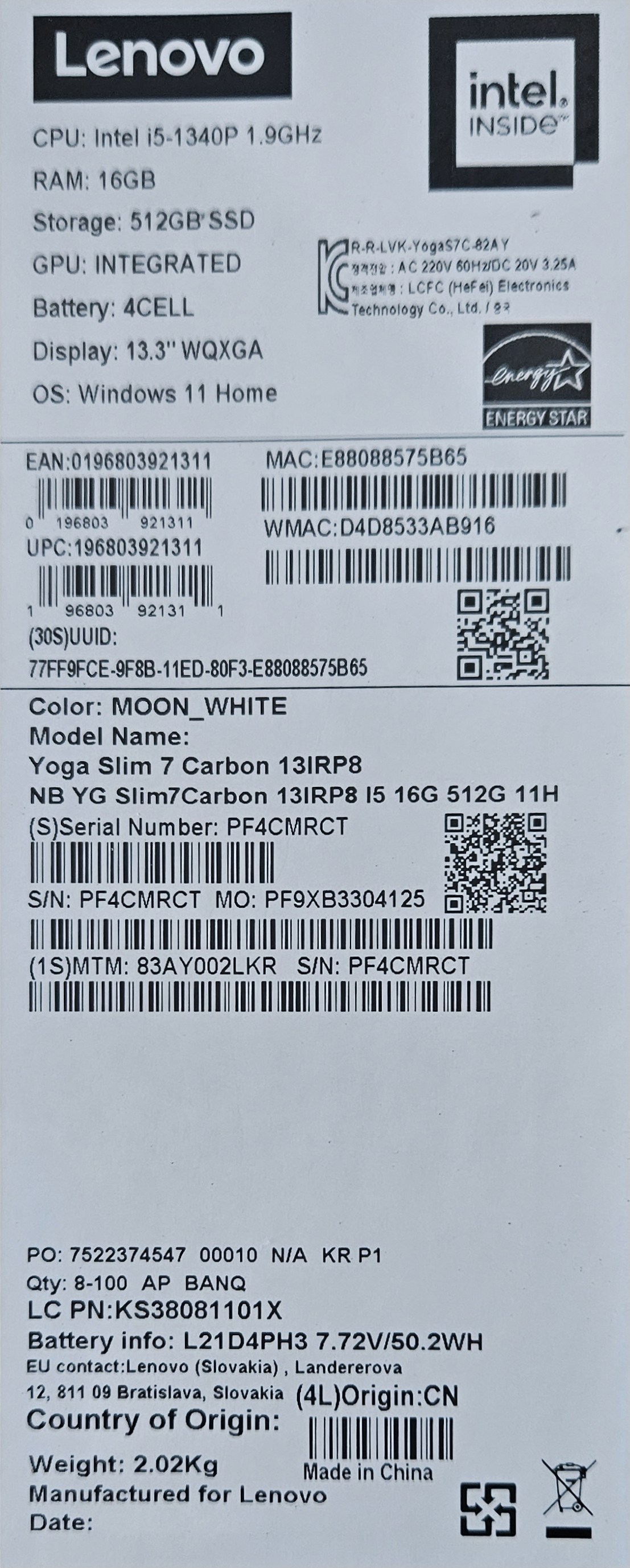 | 품명 및 모델명 | 노트북 컴퓨터 [모델명 : Lenovo YOGA Slim 7 Carbon13IRP8 83AY002JKR / 인증모델명 : 83AY] | KC 인증정보 | R-R-LVK-YogaS7C-82AY, XU102330-22107A |