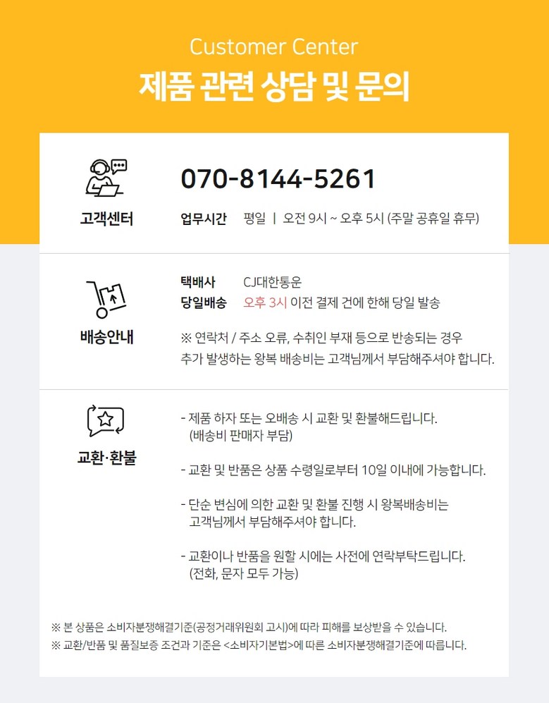| 소비자상담 및 교환반품 문의 | 쿠팡고객센터 1577-7011 배송 및 환불/교환에 대한 문의는 마이쿠팡-고객센터 내 상담하기를 이용해주세요. | ||