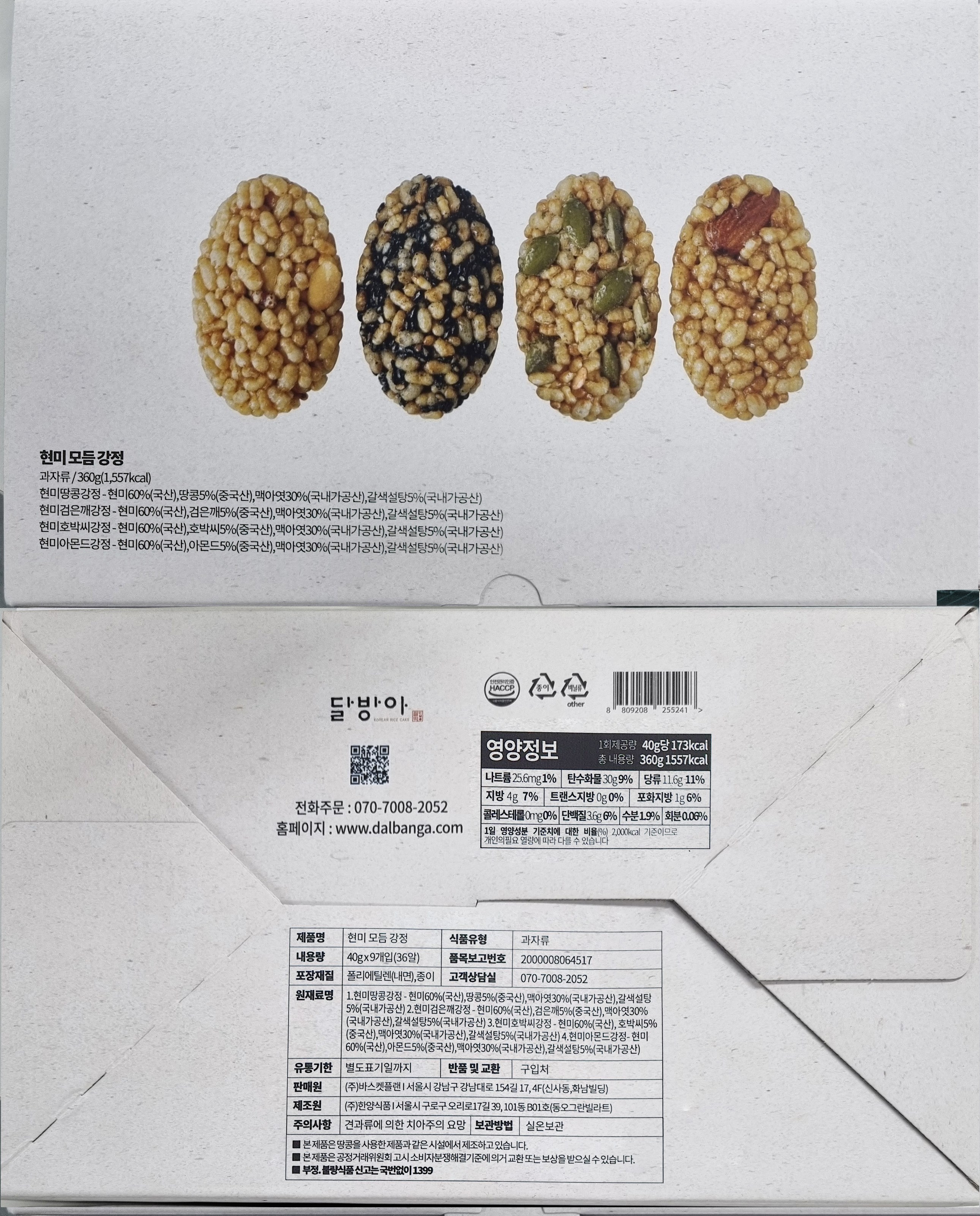 | 포장단위별 내용물의 용량(중량), 수량 | 현미강정 360g(40g x 9개입) + 통강정 450g(50g x 9개입), 1개 | 원재료명 및 함량 | 컨텐츠 참조 |