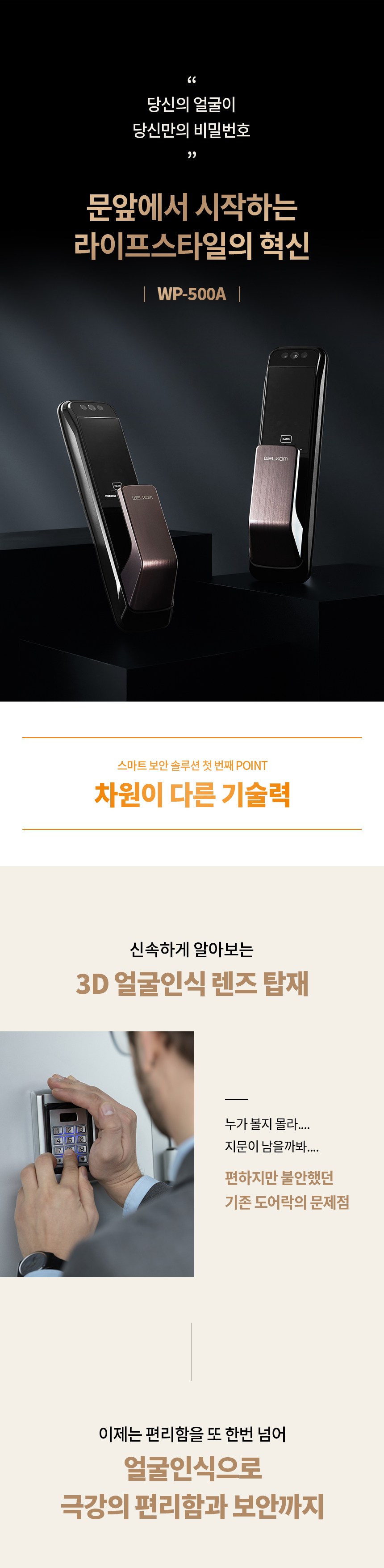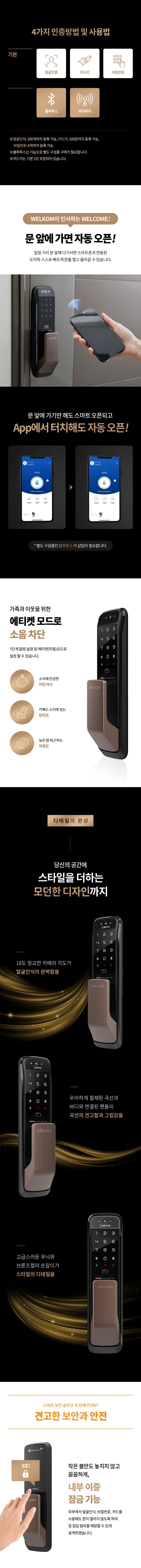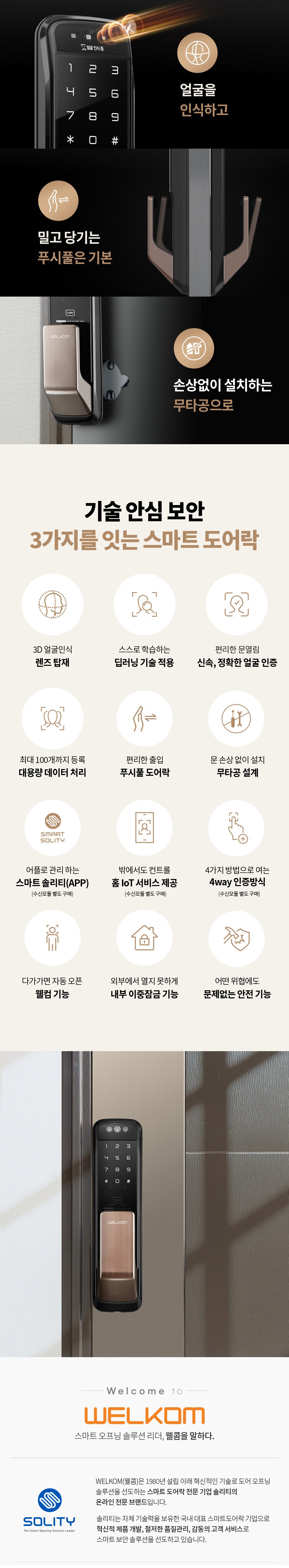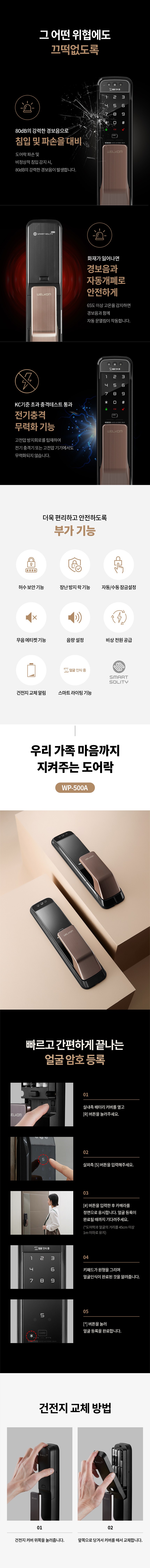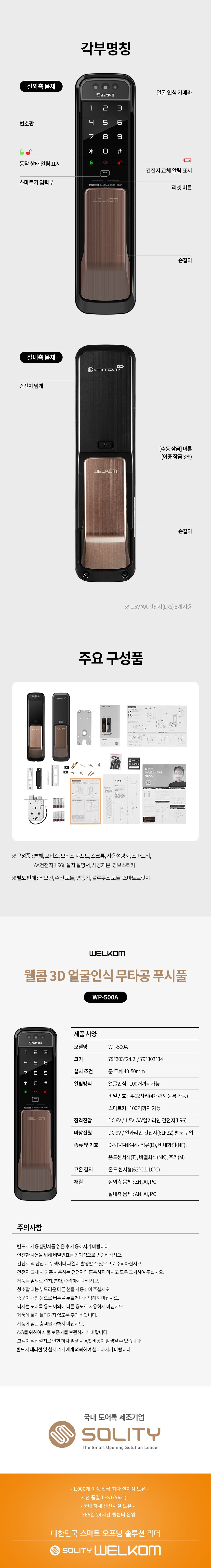 | 품명 및 모델명 | 웰콤 솔리티 얼굴인식 무타공 푸시풀 도어락 WP-500A | KC 인증정보 | 도어락: KS C 9806 제07-3333호, B223A5005-20013J, R-R-HG0-WP-500A, 건전지 : B052R1059-19002 |
