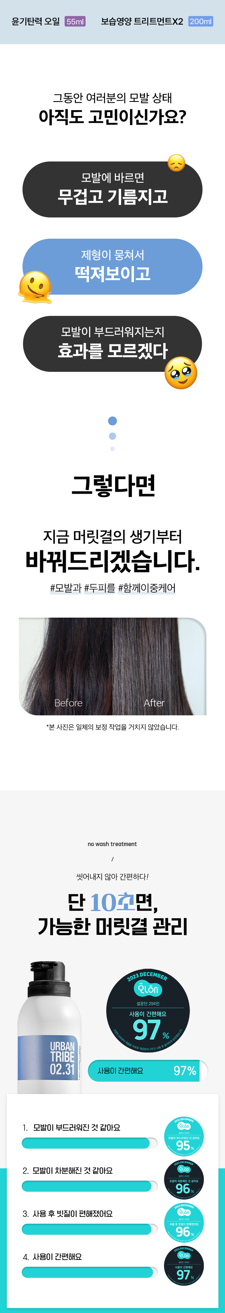 | 사용기한 또는 개봉 후 사용기간 | 제품별도표시 | 사용방법 | 폼 : 사용 전 내용물을 흔든 후 손바닥에 적당량을 취해 타올 드라이한 모발 또는 마른 모발에 골고루 발라 흡수시켜 줍니다. 오일 : 손바닥에 적당량을 취해 모발에 골고루 발라줍니다. |