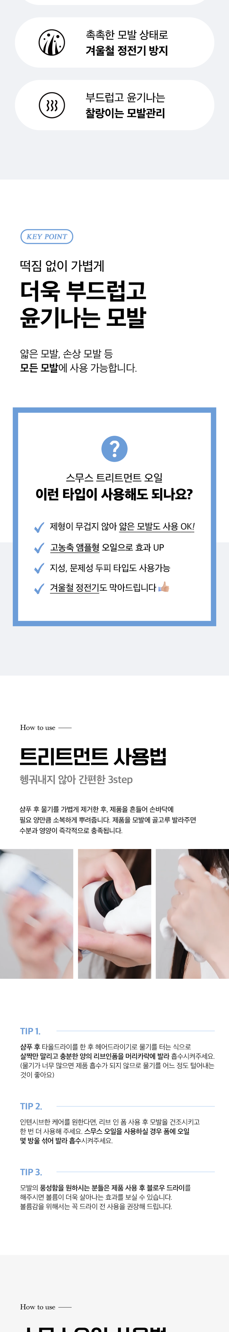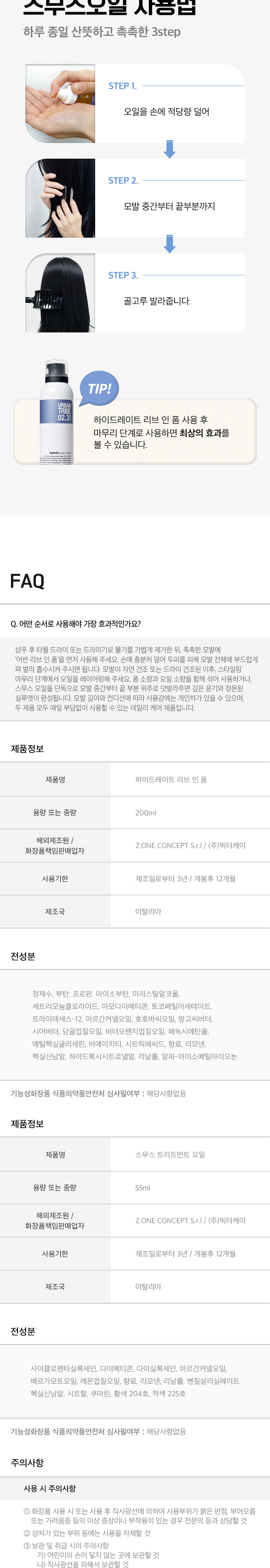 | 사용기한 또는 개봉 후 사용기간 | 제품별도표시 | 사용방법 | 폼 : 사용 전 내용물을 흔든 후 손바닥에 적당량을 취해 타올 드라이한 모발 또는 마른 모발에 골고루 발라 흡수시켜 줍니다. 오일 : 손바닥에 적당량을 취해 모발에 골고루 발라줍니다. |