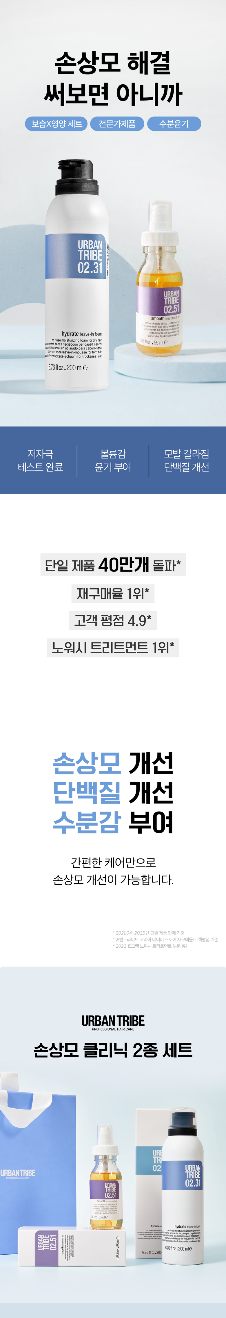 | 용량(중량) | 폼 : 200ml X 1개, 오일 : 55ml X 1개 | 제품 주요 사양 | 극손상모, 손상모, 엉키는 모발을 부드럽게 해주는 노워시 트리트먼트와 모발에 수분과 영양을 채워주는 헤어 오일 에센스 세트 제품 |