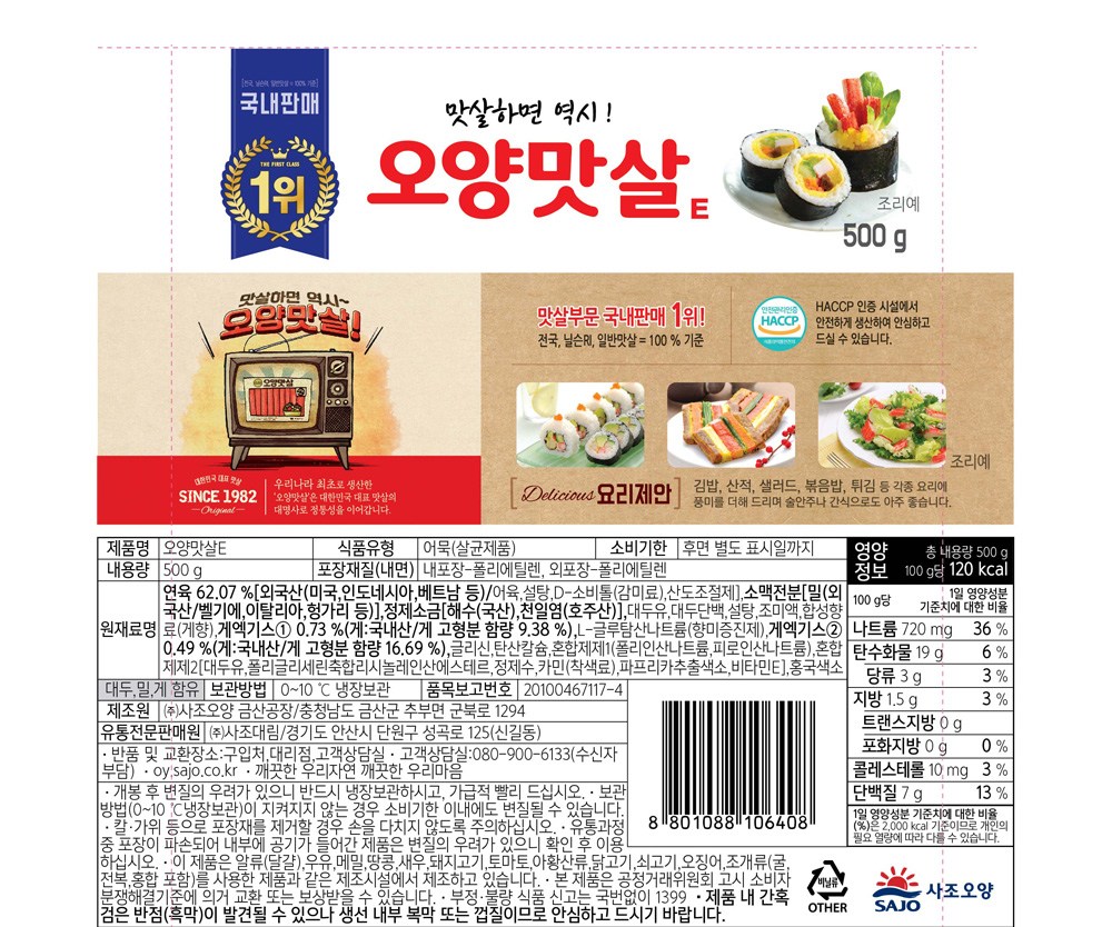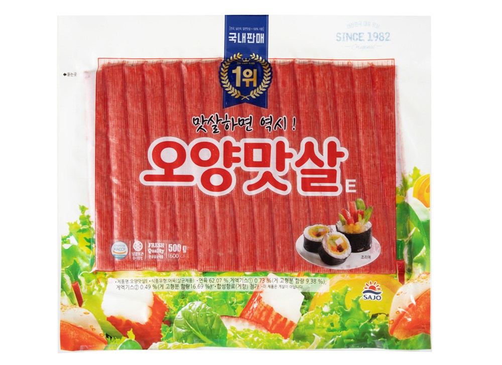 김밥 속 단골 재료, 맛살이에요. 탱글탱글한 식감과 담백한 풍미가 일품이죠. 게엑기스를 더해 구수한 감칠맛을 선사해요. 잘게 잘라 볶음밥에 넣어도 맛있고, 마요네즈와 버무려 샐러드로 즐겨도 좋아요.