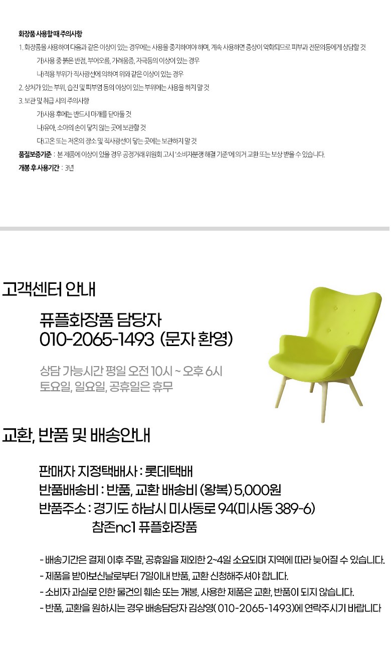 - ㆍ모니터 해상도의 차이로 인해 색상이나 이미지가 실제와 달라, 고객이 단순 변심으로 교환/반품을 무료로 요청하는 경우