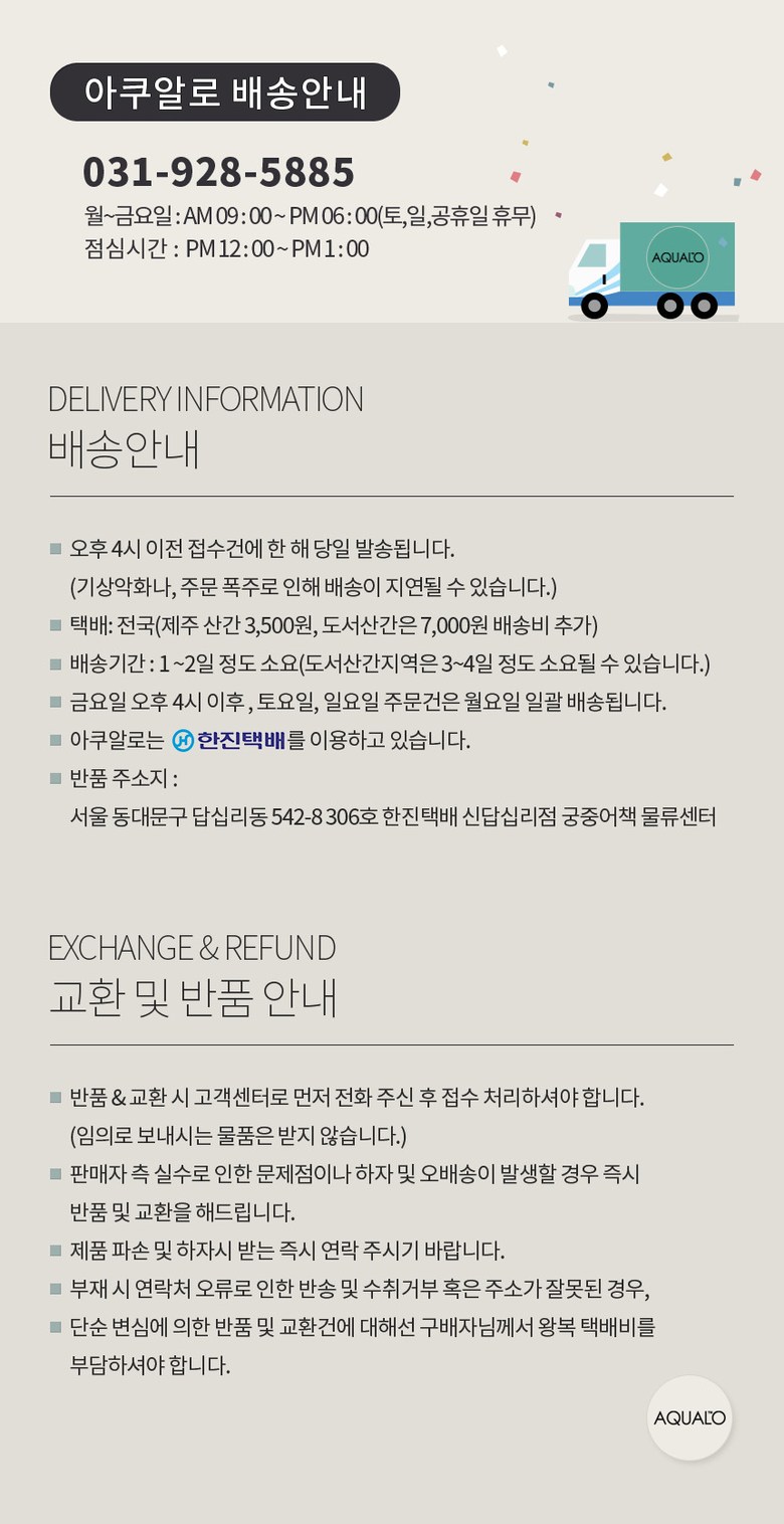 - ㆍ모니터 해상도의 차이로 인해 색상이나 이미지가 실제와 달라, 고객이 단순 변심으로 교환/반품을 무료로 요청하는 경우