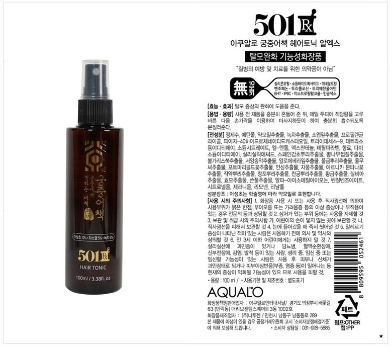 | 화장품제조업자, 화장품책임판매업자 및 맞춤형화장품판매업자 | 아쿠알로 인터내셔날 | 제조국 | 한국 |