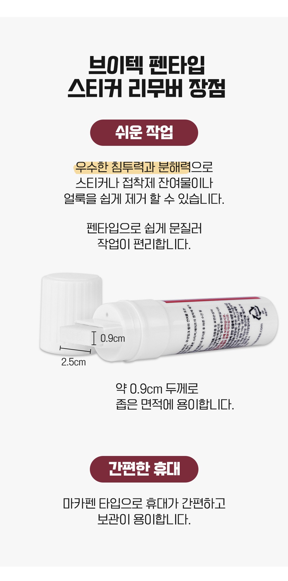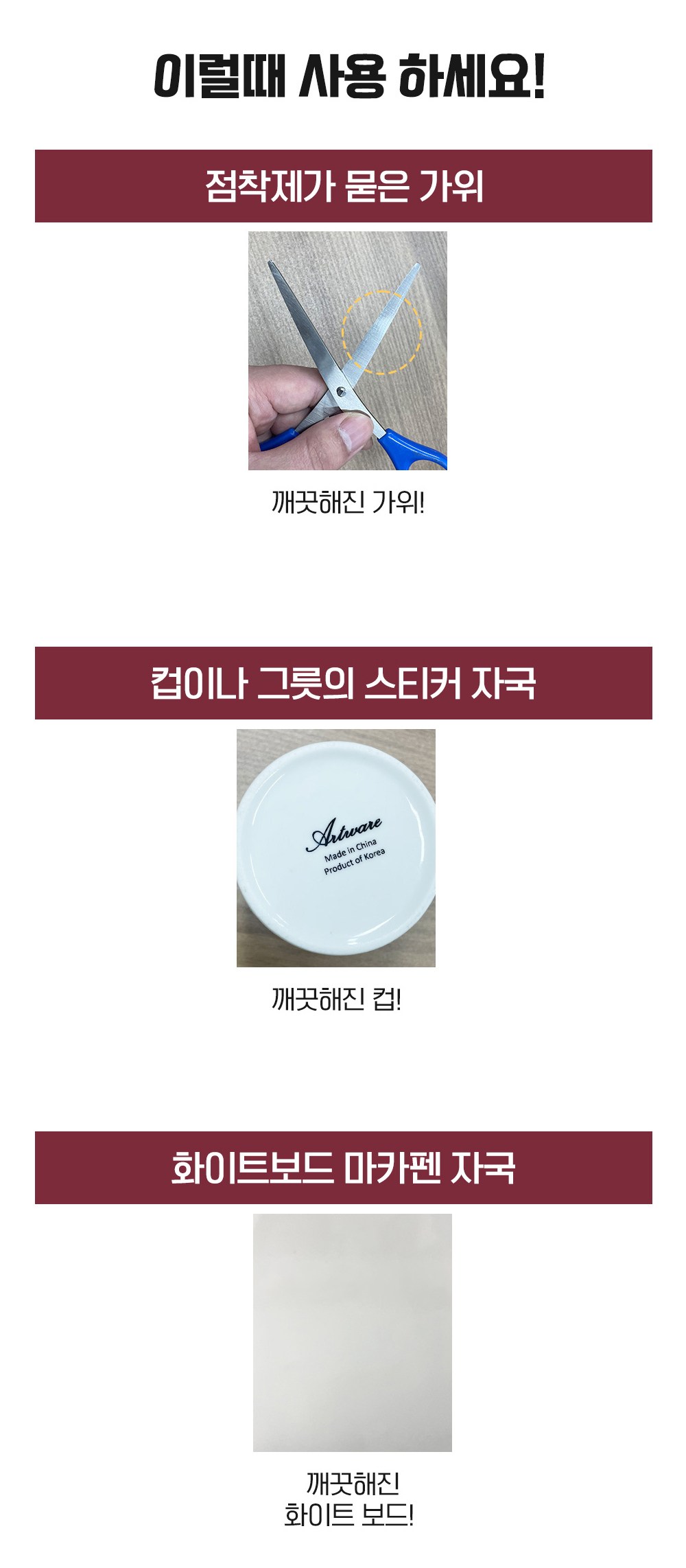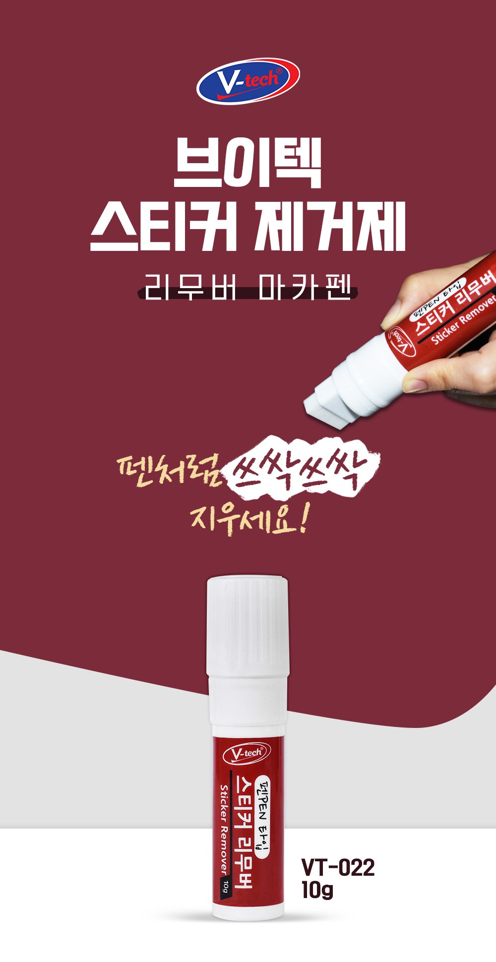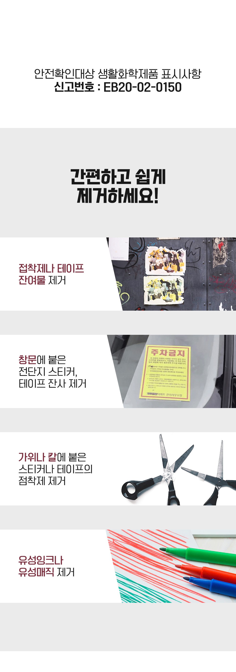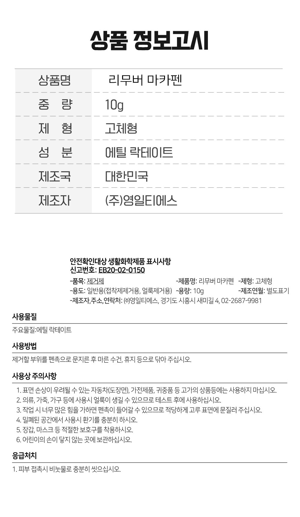 | 품목 및 제품명 | 제거제 / 리무버 마카펜 | 용도(표백제의 경우 계열을 함께표시) 및 제형 | 일반용(접착제제거용,얼룩제거용) , 비분사형-고체형 |