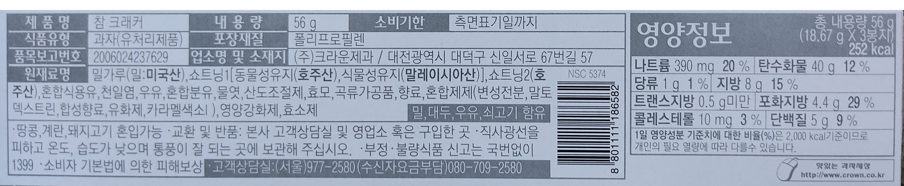 | 제품명 | 참크래커 | 식품의 유형 | 과자(유처리제품) |