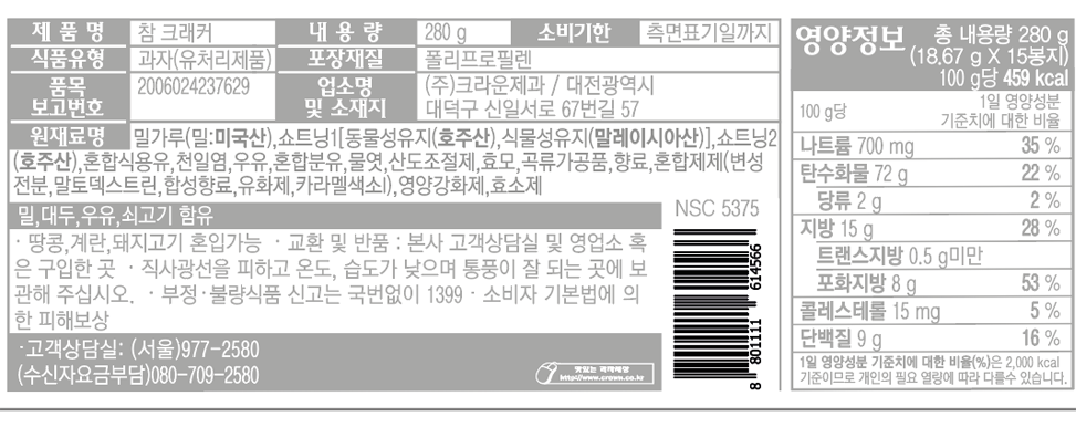 | 제품명 | 참크래커 | 식품의 유형 | 과자(유처리제품) |
