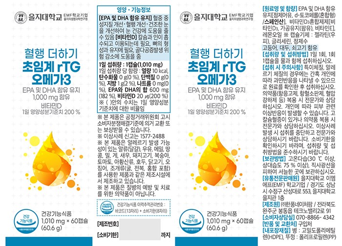| 제품명 | 혈행 더하기 초임계 rTG 오메가3 | 제조업소의 명칭과 소재지 | 컨텐츠 참조 |