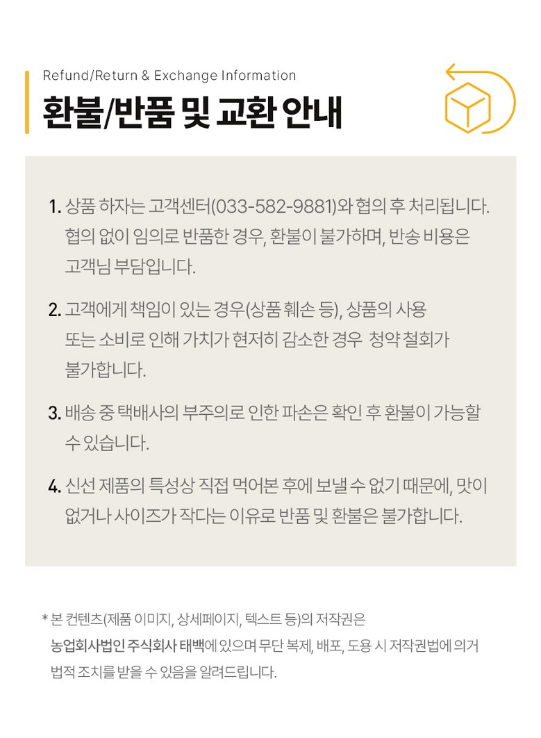 - ㆍ교환/반품에 관한 일반적인 사항은 판매자가 제시사항보다 관계법령이 우선합니다.