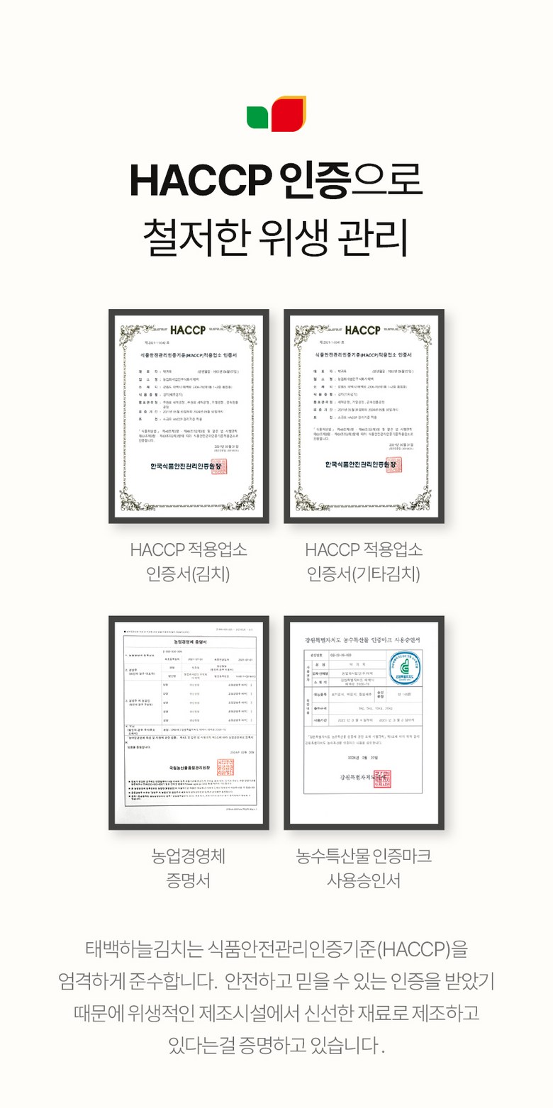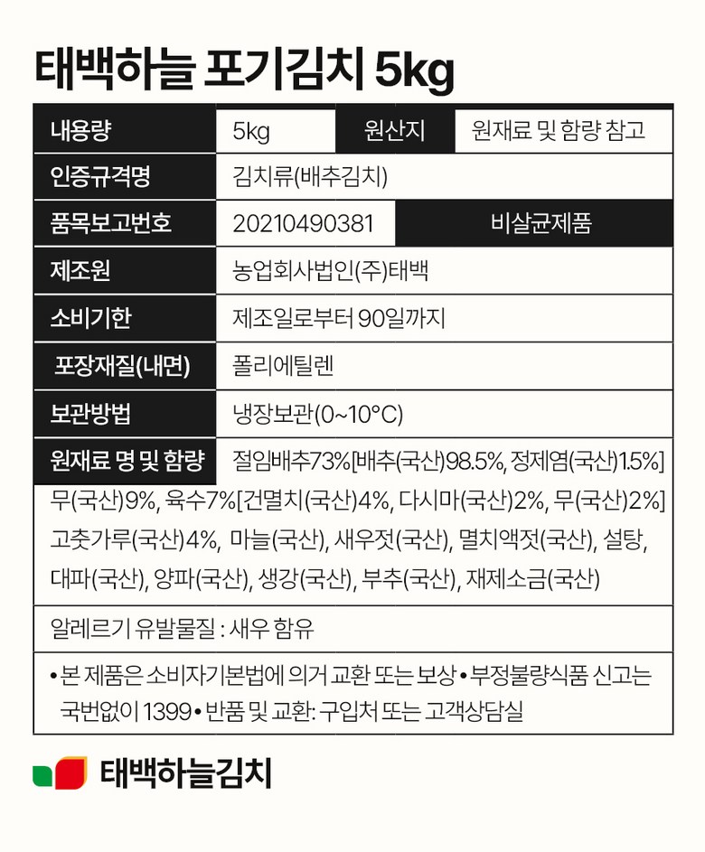 | 품목 또는 명칭 | 태백하늘김치 | 포장단위별 내용물의 용량(중량),수량,크기 | 10kg 7kg 5kg 3kg |